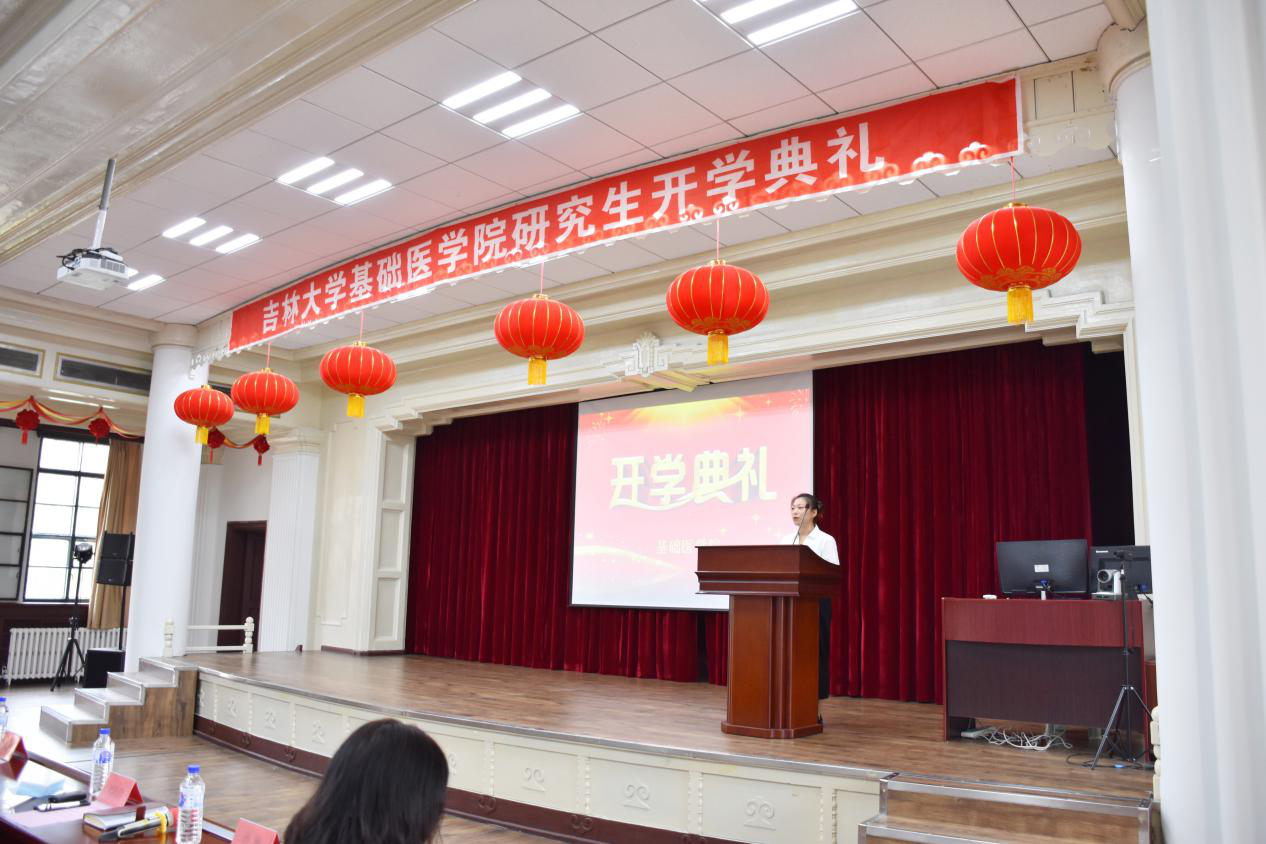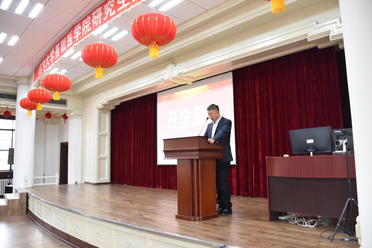 Practice development and brave the winds and waves. At 9 o'clock in the morning on 22th September, the opening ceremony of the new graduate students of the College of Basic Medical Sciences was held in the lecture hall on the second floor of the Colledge. Professor Liankun Sun, Dean of School of Basic Medical Sciences, Professor Shuang Zheng, Secretary of the Party Committee, Professor Haiyan Liu, vice-president, Professor Ying Xin, vice-president, Professor Wei Sun, vice-president, Professor Pixian Cheng, and Directors and Associate Directors of Teaching and Research Sections of each department attended the opening ceremony. The ceremony was presided over by Guoli Cao, deputy Secretary of the Party Committee.