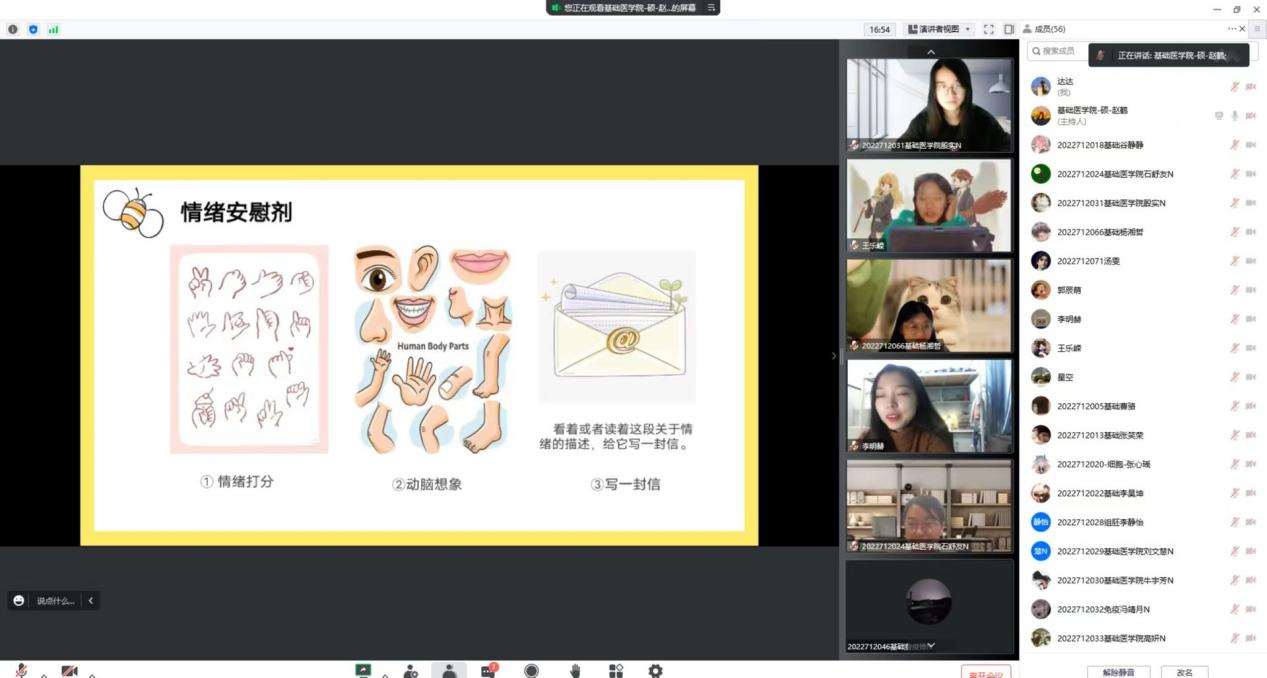 为了全面贯彻党的教育方针、推进素质教育,加强和改进大学生心理健康,提高大学生心理调节能力,培养良好心理品质,促进大学生思想道德素质和心理健康成长,更有利于大学生的科学文化素质和身心健康素质的协调发展。基础医学院学生朋辈心理辅导员于10月17日通过线上腾讯会议的方式,在2022级研究生班级中组织开展新生团体心理辅导活动。