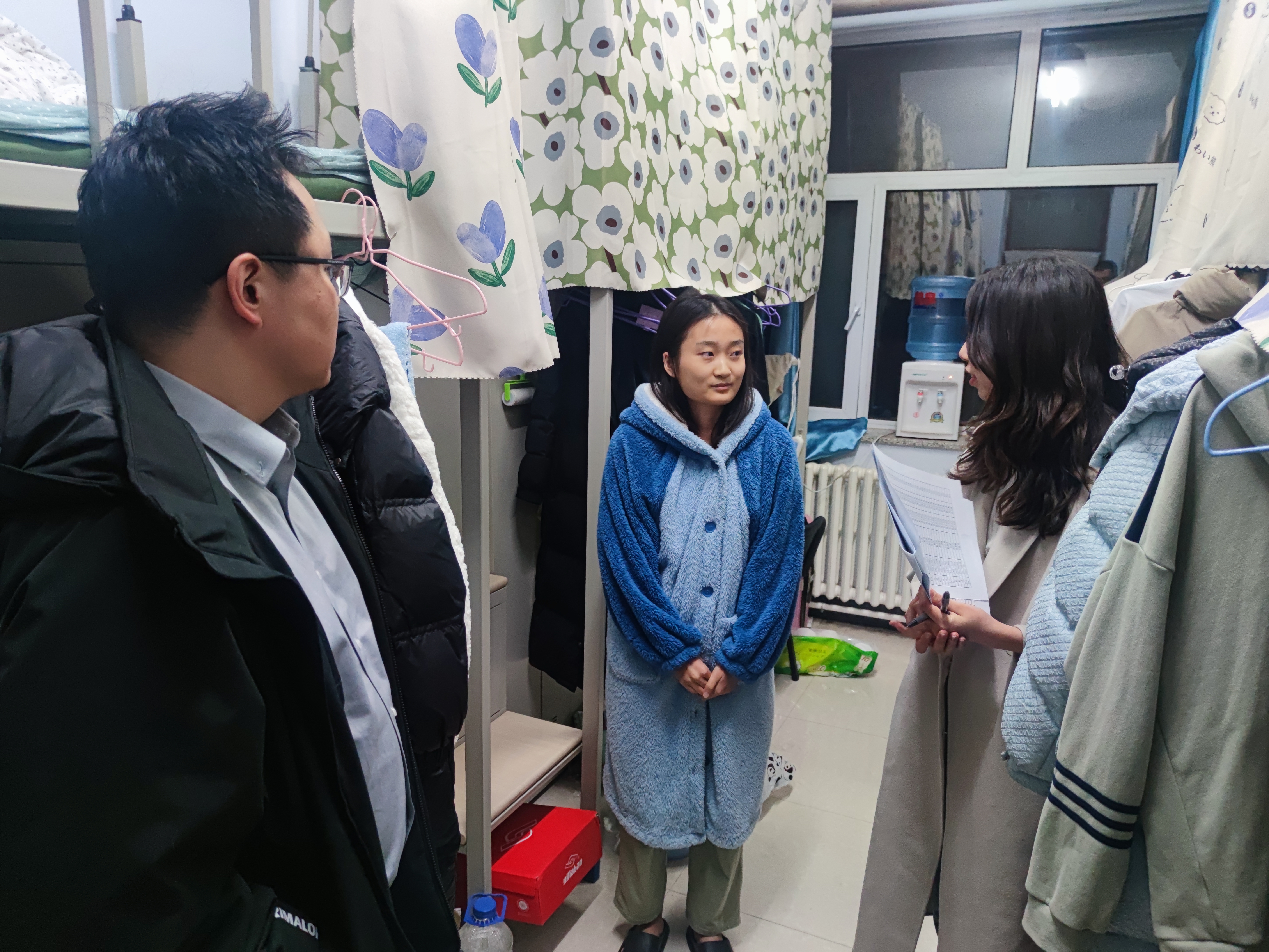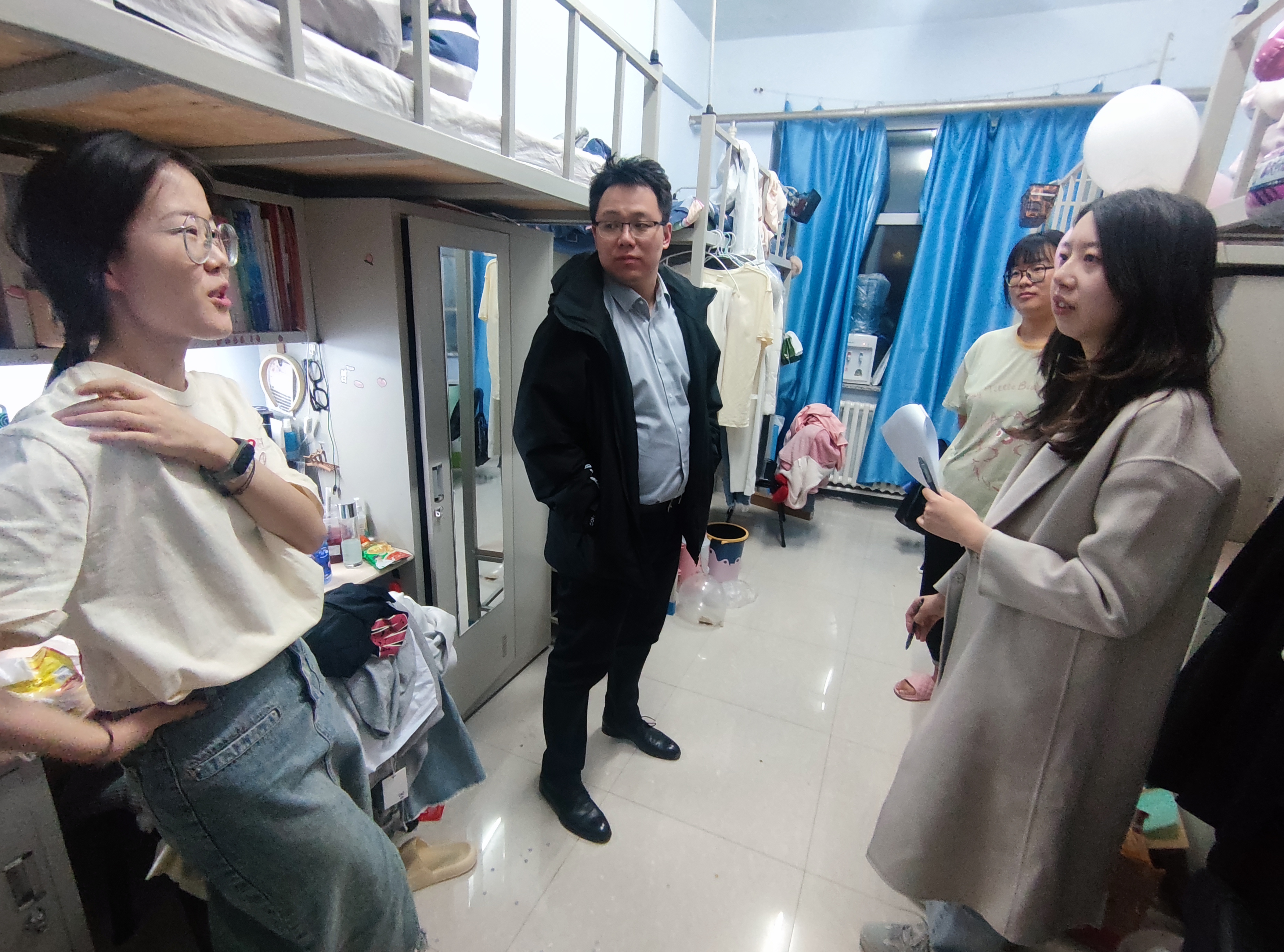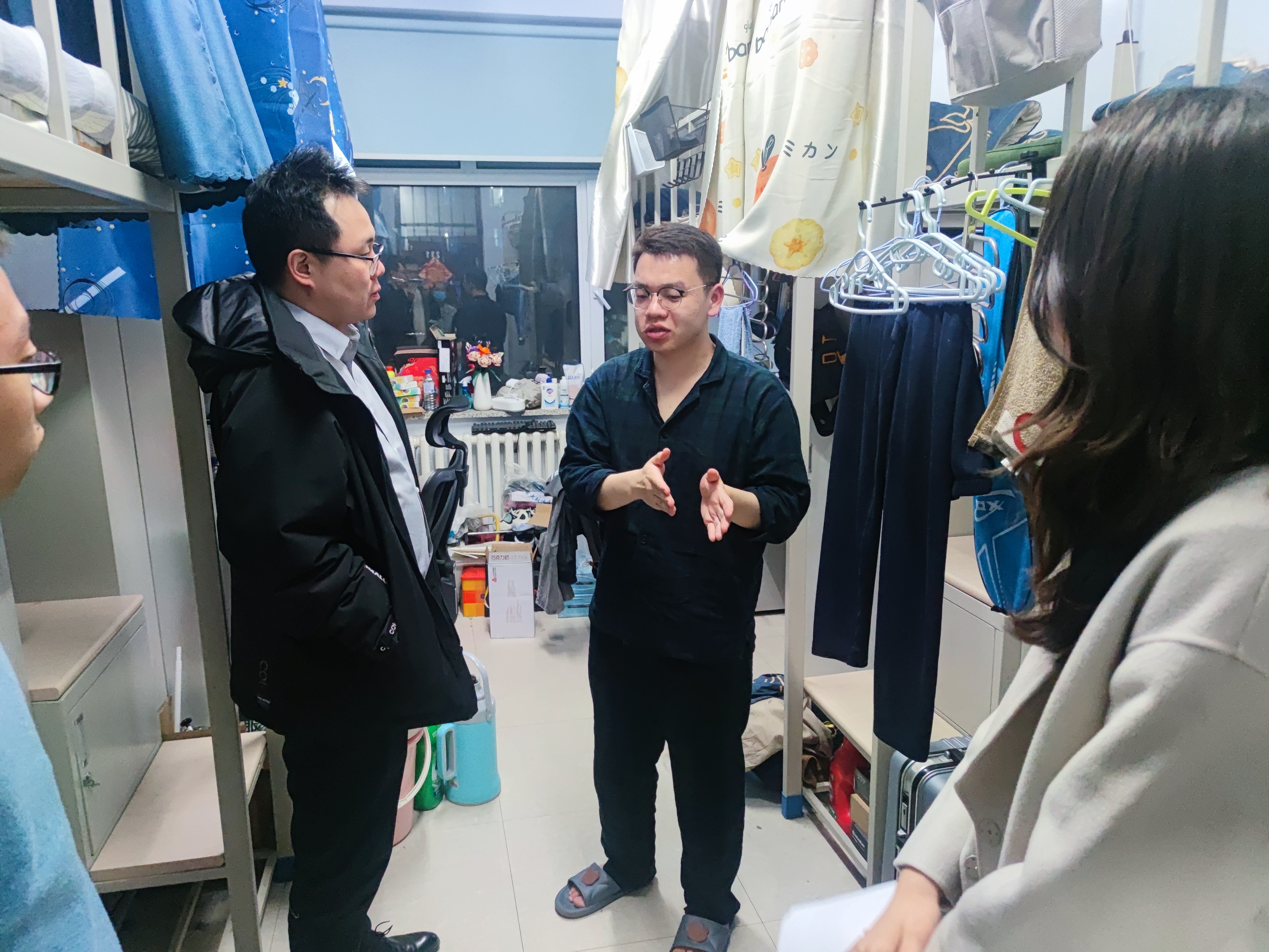 走访寝室过程中,老师们详细了解了同学们的学习、科研以及生活情况,并询问了近期的思想动态和学习工作中遇到的困难。检查内容除寝室卫生状况外,还包括对违章电器及电源使用情况的排查,尤其强调要强化寝室生活消防安全意识。