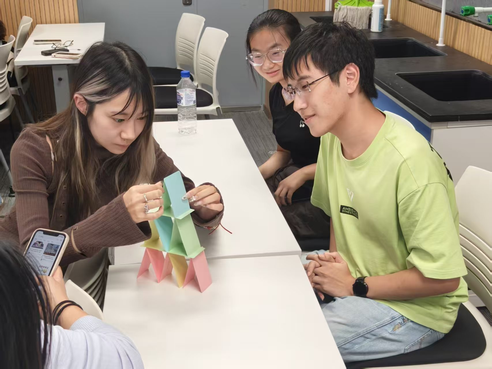 活动伊始,“一分钟鼓掌” 游戏拉开了序幕。在朋辈心理辅导员的引导下,新生们先预估自己一分钟内能够鼓掌的次数,随后全身心投入到鼓掌环节中,也以一种充满激情的方式迅速融入了活动氛围。接下来的活动则是充满了趣味与挑战的团体游戏环节,包括“我知道” 自我介绍环节,“人体字母”、“众志成城” 等团队协作环节,以及“快乐传递”、“我爱我班”、“绘制团体树”、“相亲相爱一家人”等走心互动环节。通过游戏的进行,同学们不断熟悉彼此、发现彼此的闪光点,活动现场的氛围不断被带动、被点燃。