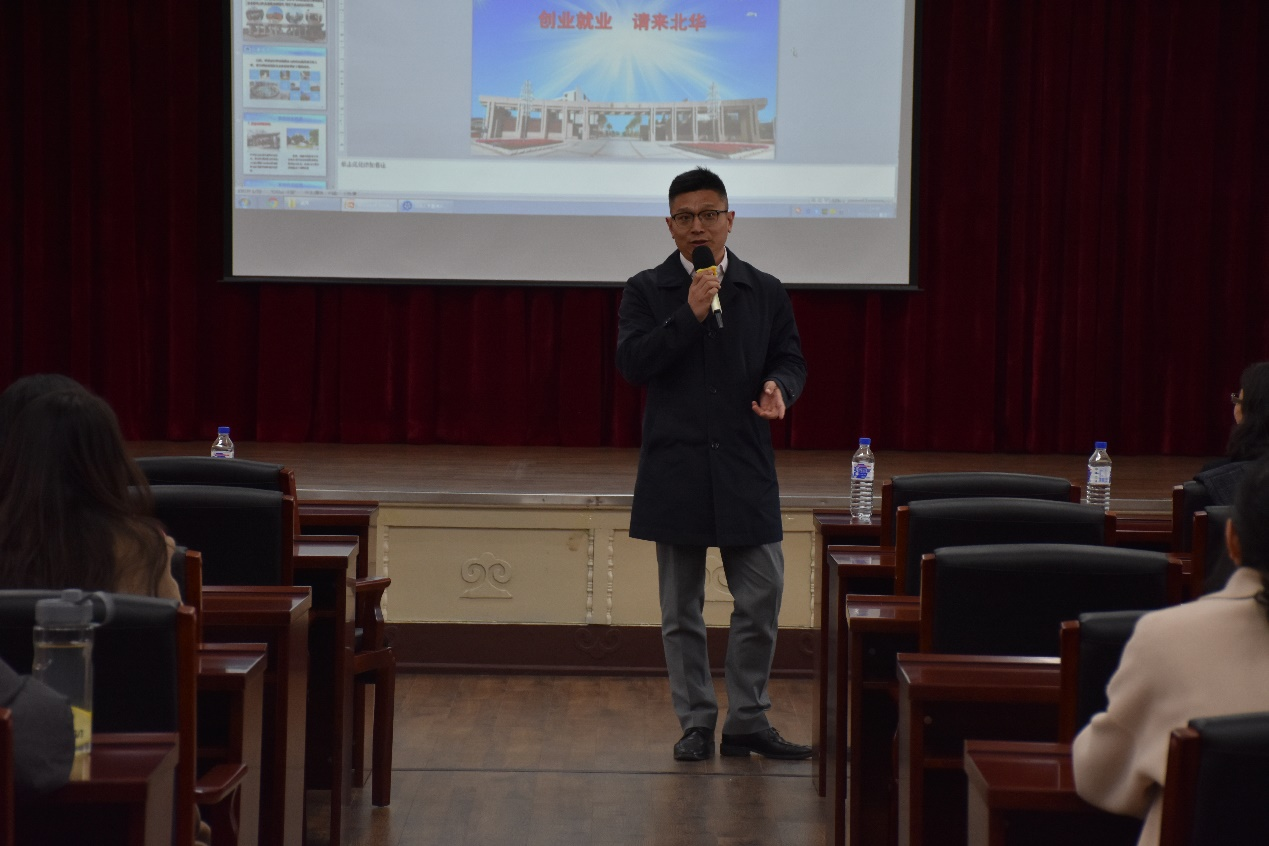 院长李咏梅,通过播放宣传片、PPT展示等方式向同学们介绍北华大学的概况、职业发展方向、人员需求以及选择该单位的理由等几个方面向同学们做了详细的介绍,并现场解答同学们的疑问。最后北华大学羞羞漫画