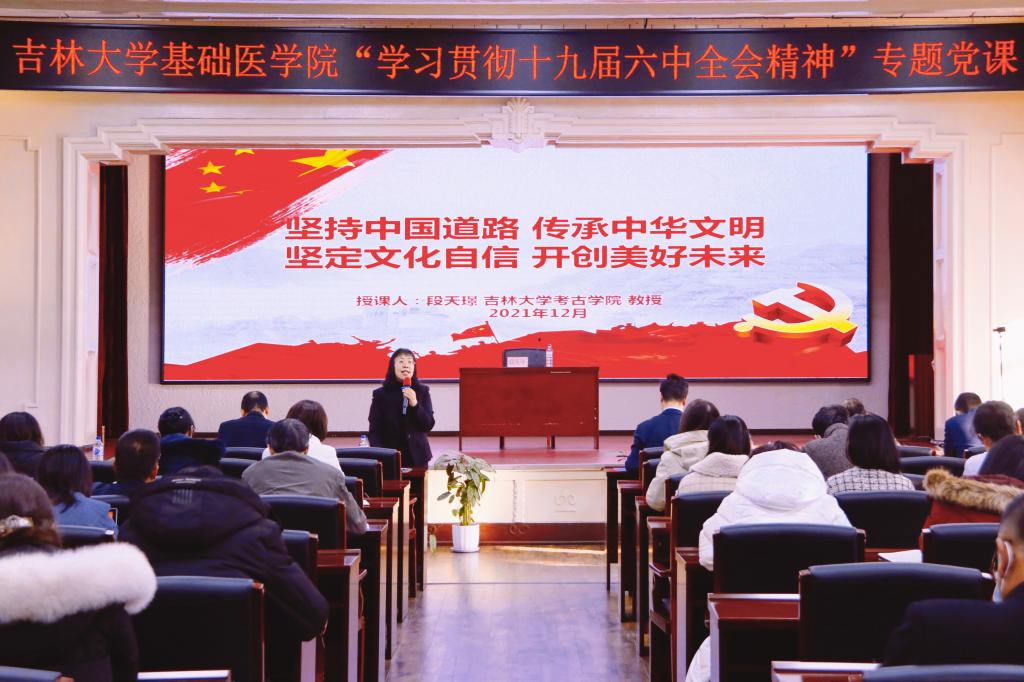 考古学院副院长、博士生导师段天璟教授为学院做了一场题为“坚持中国道路,传承中华文明,坚定文化自信,开创美好未来”的专题党课。报告会由学院党委书记王晓荣主持,学院领导班子成员、中层干部及师生党员共计一百余人参加了本次党课学习。
