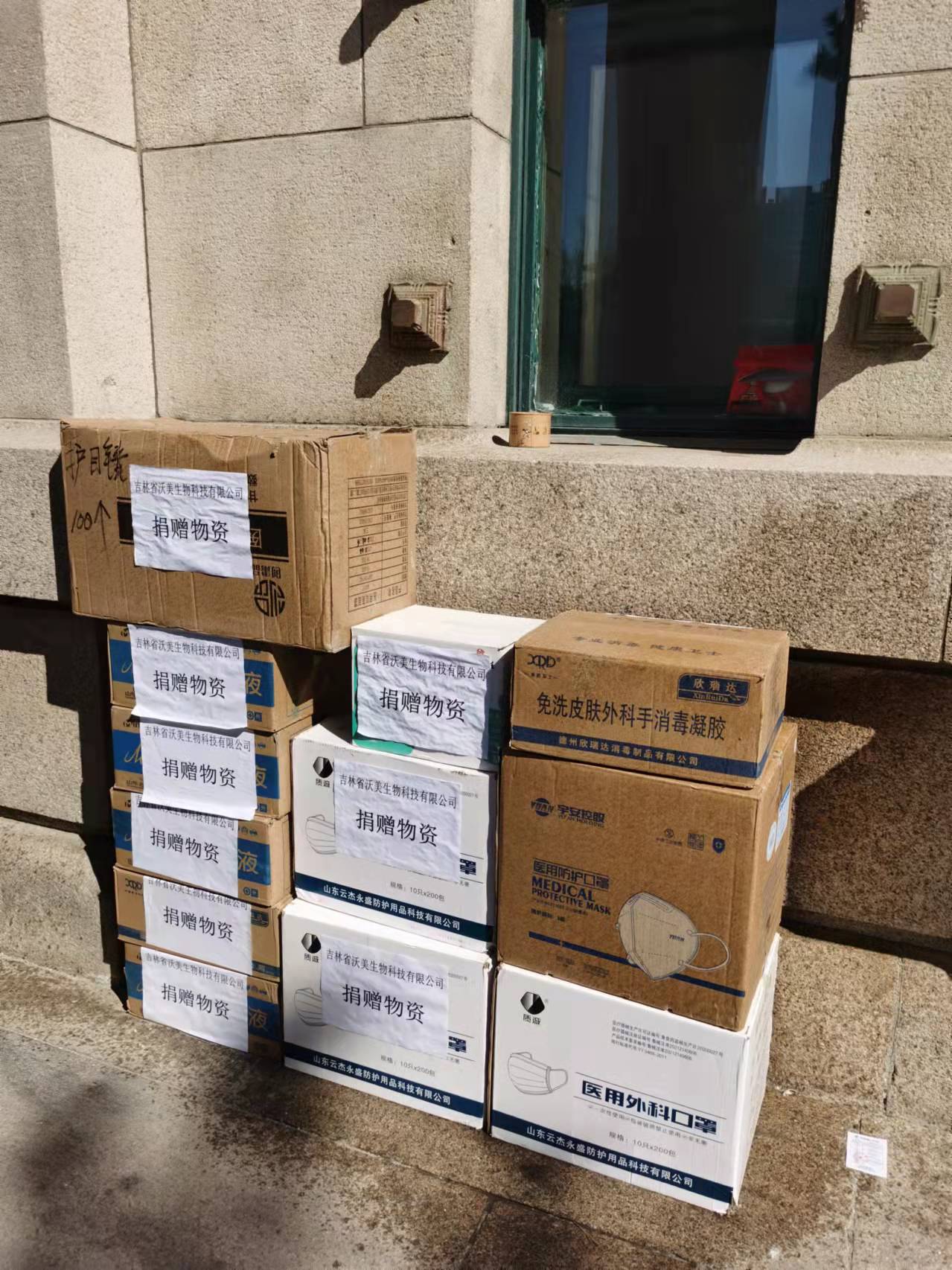 陆续收到姚云鹏校友、北京遥领医疗科技公司何冰校友及吉林省沃美生物科技有限公司、长春市尚宝生物试剂经销处、长春市宏鑫实验仪器经销处等社会企业捐赠的医用外科口罩、N95口罩、75%酒精、医用防护眼镜及医用手套各类防疫物资,总价值10万余元。
