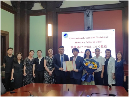接下来王放为高桥泰教授颁发聘书,高桥泰教授发表受聘感言。高桥泰教授表示非常荣幸被聘请为《国际老年医学杂志》名誉主编,而后对日本过去30年相关高龄者养老及高龄化社会制度进展及现状进行简单介绍,并为与会人员讲授了他的研究成果—老年人能力评估工具TAI的使用方法及作用,为中国老龄化政策制定和养老行业的发展提供了许多新的思路。
