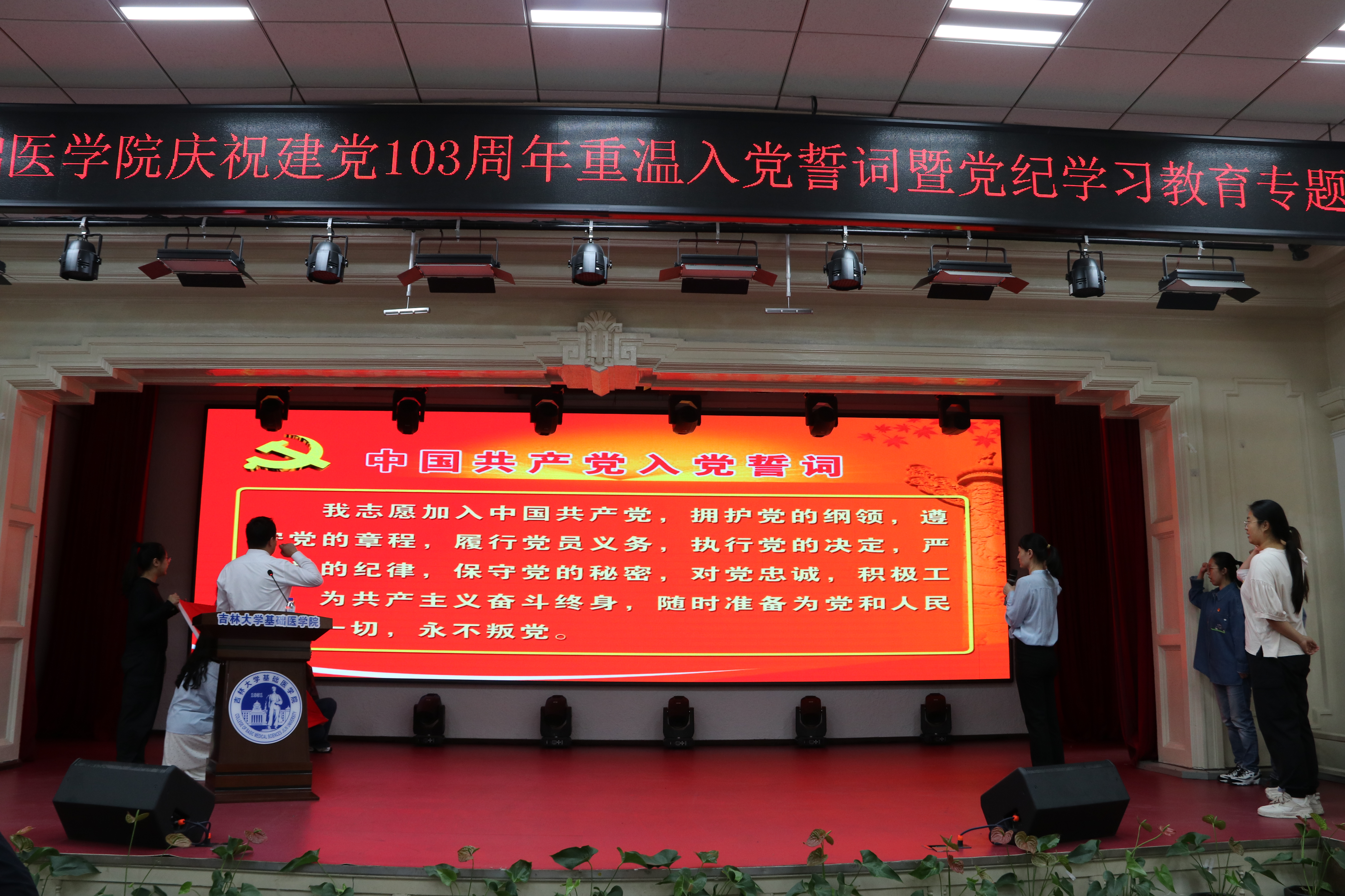 召开庆祝建党103周年重温入党誓词暨党纪学习教育专题党课。学院领导班子成员、党委委员、纪委委员、党支部委员、中层党员干部以及新发展党员和部分积极分子参加了会议。会议由学院党委副书记、纪委书记李东洋主持。