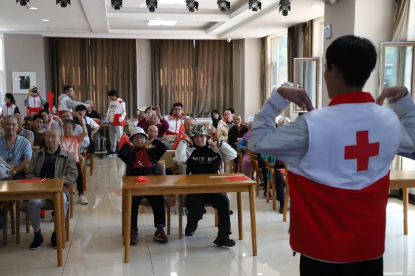志愿者们还特意为老人们准备了专为老年人设计的动作简单舒缓、富有趣味性的低强度全身拉伸舒展操,现场与老人们互动。老人们在志愿者的鼓励和演示下积极参与,活动现场洋溢着轻松愉快的气氛。