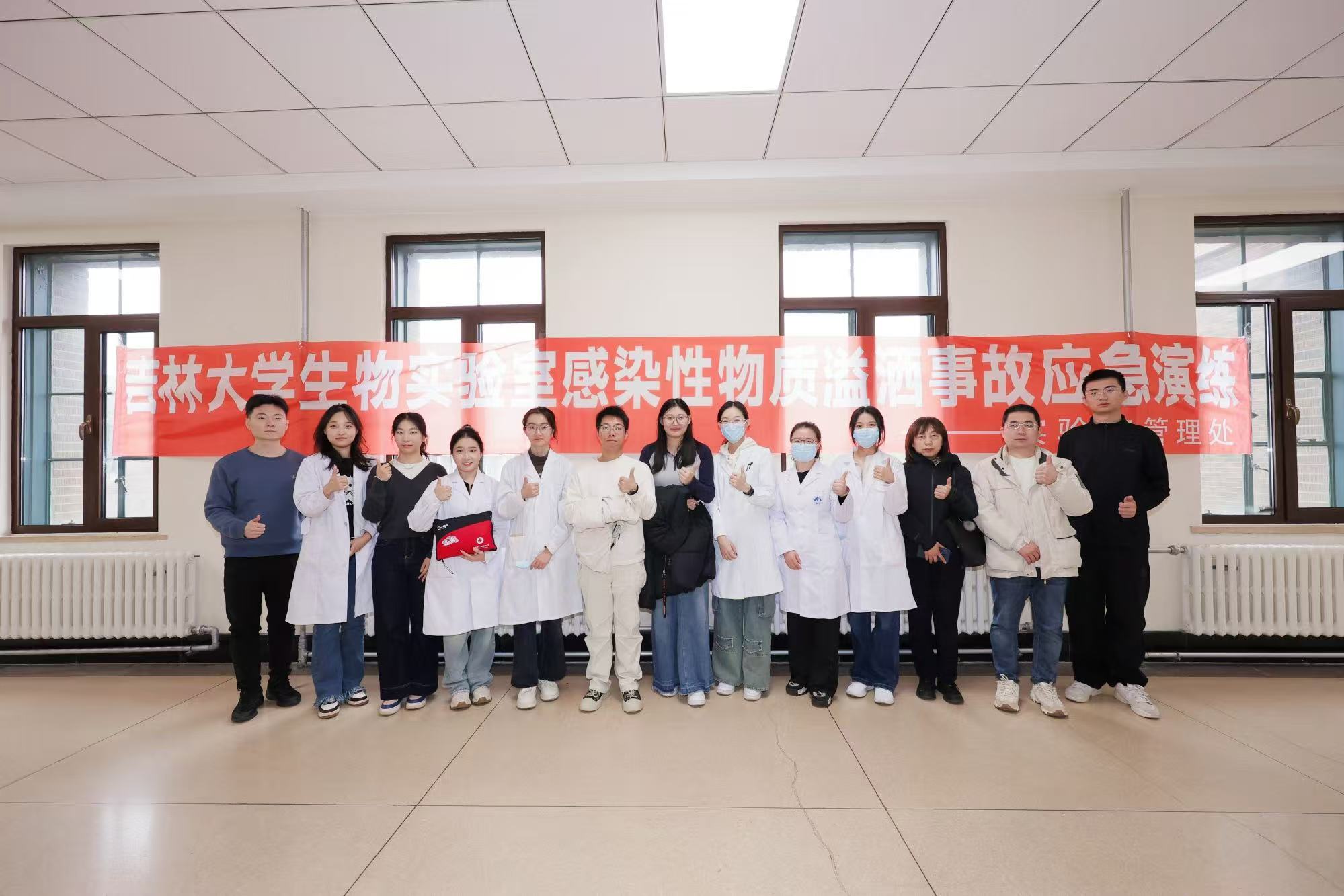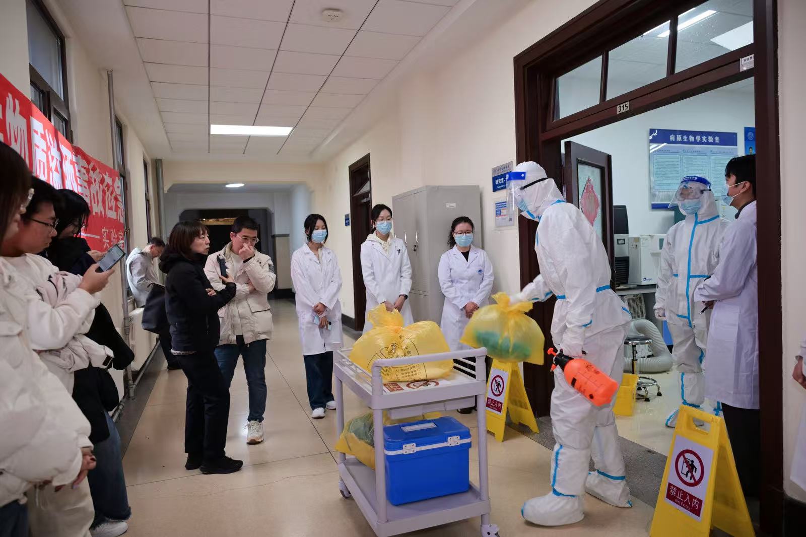 生物实验室感染性物质溢洒事故应急演练。以“实验人员在转移生物病原体标本时将标本摔落在地”为模拟案例,真实模拟实验室病原微生物泄漏的全过程。涵盖了事故场景模拟、应急疏散、现场临时隔离、事故报告、应急处置、应急救助、现场恢复等环节,通过演练使师生掌握生物样品溢撒后应急处置的正确措施,明确个人安全防护要求,防止污染扩散影响到周围环境,保障人员安全。