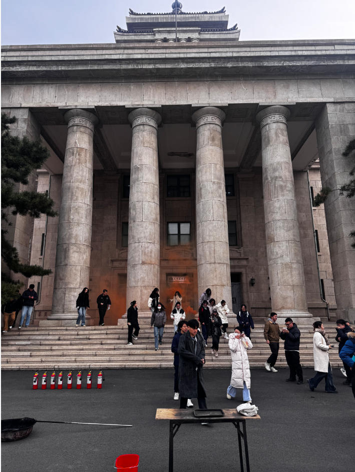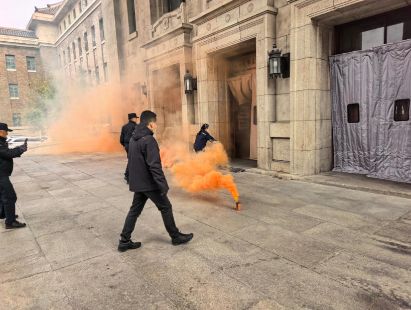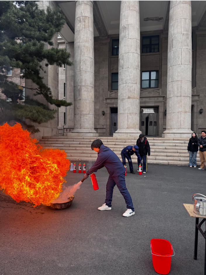 培训结束后,学院组织了疏散逃生和消防灭火实操演练活动,按活动前安排,学院组成由通讯组、疏散组、灭火组、医疗组、保障组组成的演练消防队,随着模拟浓烟升起,消防队帮助师生熟悉疏散逃生路线、掌握疏散逃生技能。大家手捂口鼻、弯下腰迅速有序地从指定楼梯和安全出口逃生,撤离到楼外的安全地带。随后,新民校区保卫处安志成老师详细演示了灭火毯、灭火器的用法,并指导老师和同学亲身体验,现场使用灭火毯、灭火器扑灭初期火灾,提升了突发情况的应急处置能力。