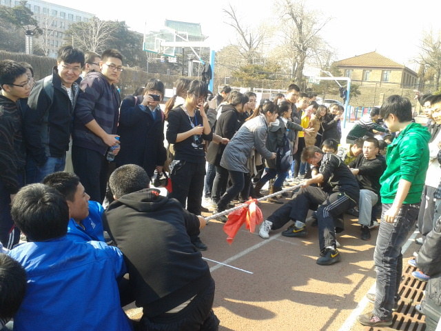 比赛共有三项趣味项目。第一项跳大绳,700904班夺得第一名,701105班、700905班分别以微小差距位列第二、第三。第二项为两人三足,每班分六组进行接力,每组均由一男一女构成。最后,701006班以1分1秒2的佳绩夺冠,701105班、701005班取得亚军、季军。最后一项比赛为拔河,每支队伍由10男10女共二十人组成,通过抽签分组层层淘汰,胜出的四个班级采用循环赛决出前三名,经过激烈对抗,桂冠由701007班斩获,701006班、700901依次排名第二、第三。