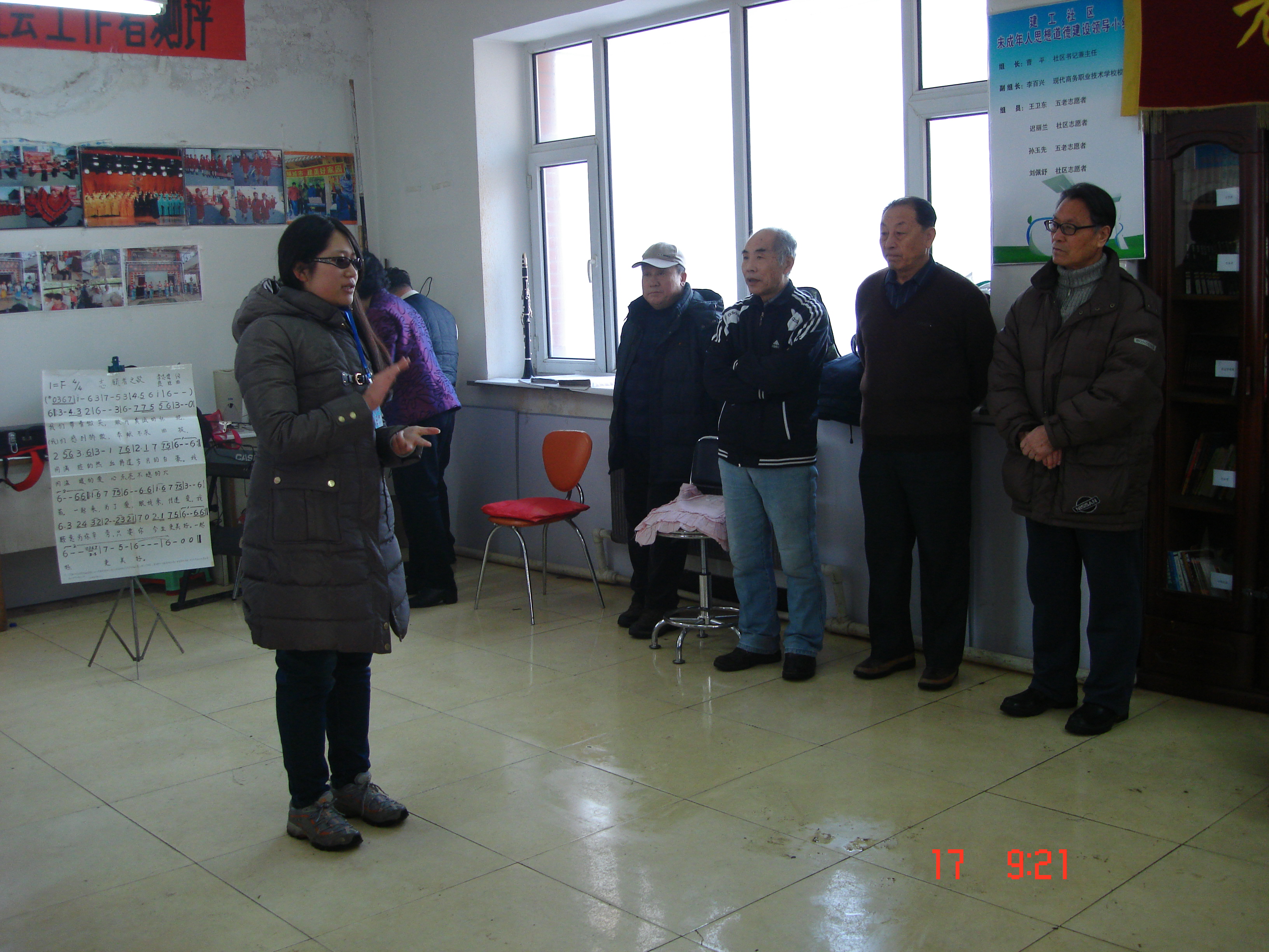 志愿者们来到建工社区,首先向在社区活动室活动的社区居民,介绍了十八大的新精神并和大家一起讨论了社区医疗的变化,紧接着志愿者们发挥自身学科优势,用通俗易懂的语言讲解常见慢性病,老年病的预防。同时,社区的老人们对同学们的到访也表示热烈的欢迎,在社区的老年合唱团的提议下,志愿者队伍与合唱团的老人们进行了“以歌会友”的活动。在社会实践的过程中,温暖欢快的氛围感染着在场的每一个人。