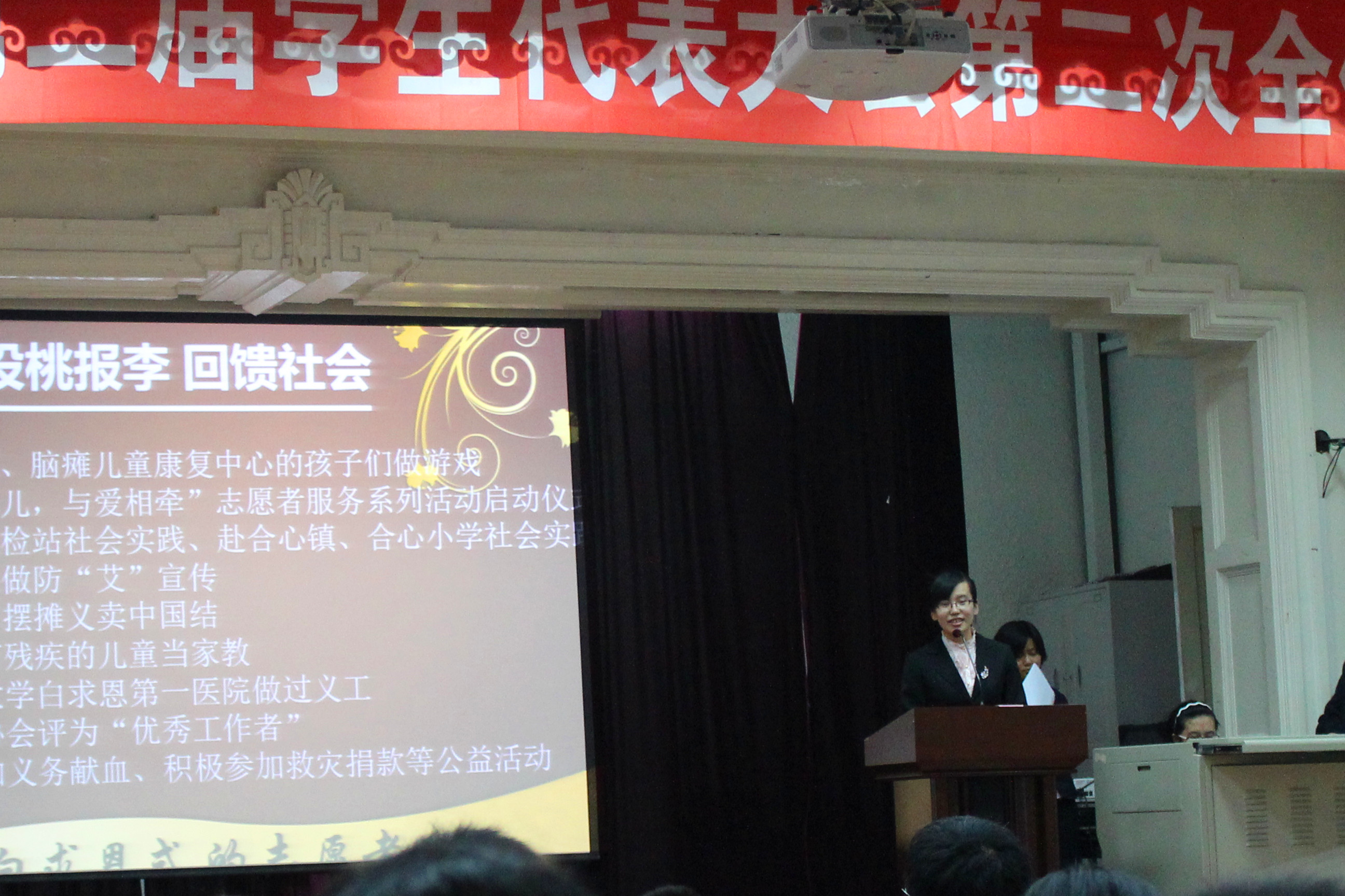 11月4号下午一点,白求恩医学院第二届学生代表大会第二次全体会议在新民校区基础楼二楼多功能学术报告厅召开。白求恩医学院党委副书记兼副院长苑锐、学生工作办公室主任吴剑锋、团委书记夏燕来、辅导员魏宇航及156名学生代表出席了本次会议。会议由院团委第一副书记单锐婷主持。