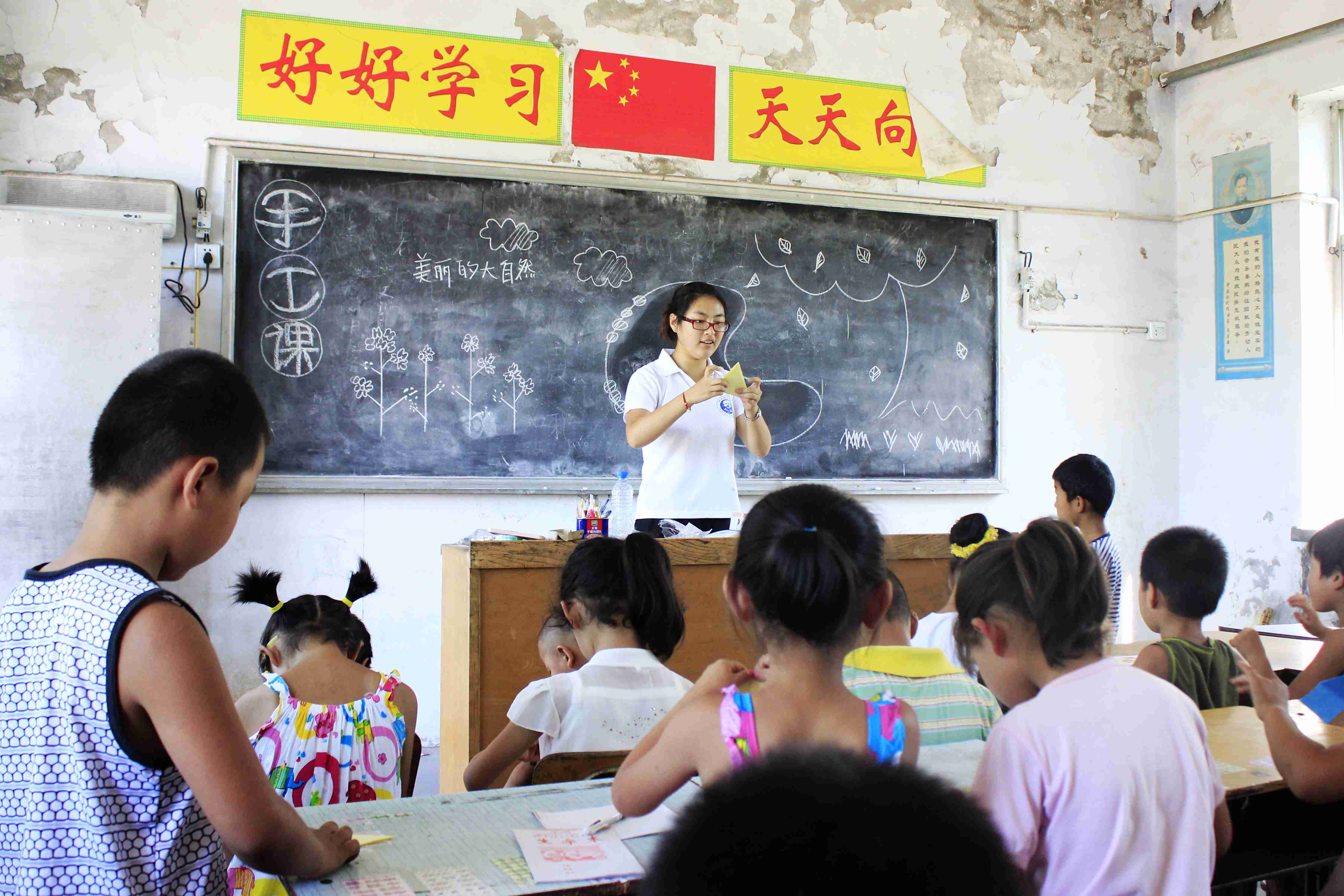 上午,朱鹤给幼儿班的孩子们上了一节有趣的手工课。手工课的题目是“美丽的大自然”。孩子们从没上过手工课,兴致很高,非常认真地跟着老师做折纸游戏,每完成一步,都兴奋地跑到讲台前,问老师自己折的是否正确,那一张张笑脸,那一双双巧手,那一个个小猫咪,那一条条小鱼,和整个课堂轻松活跃的气氛,都让队员们记忆犹新。孩子们在课堂上非常活跃,也非常积极地回答老师提出的各种各样的问题,“老师”,“老师”的叫着,感动而又温暖。
