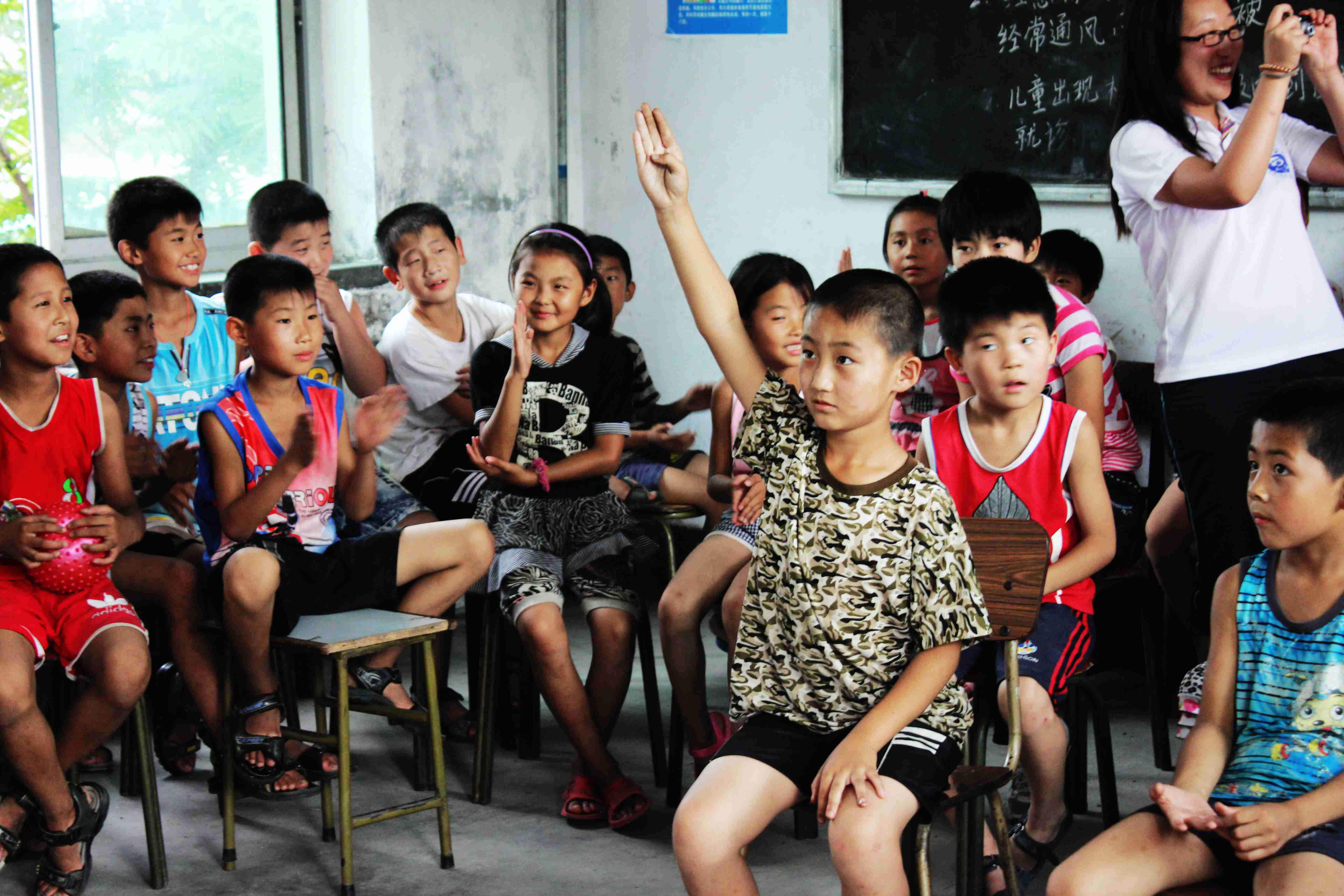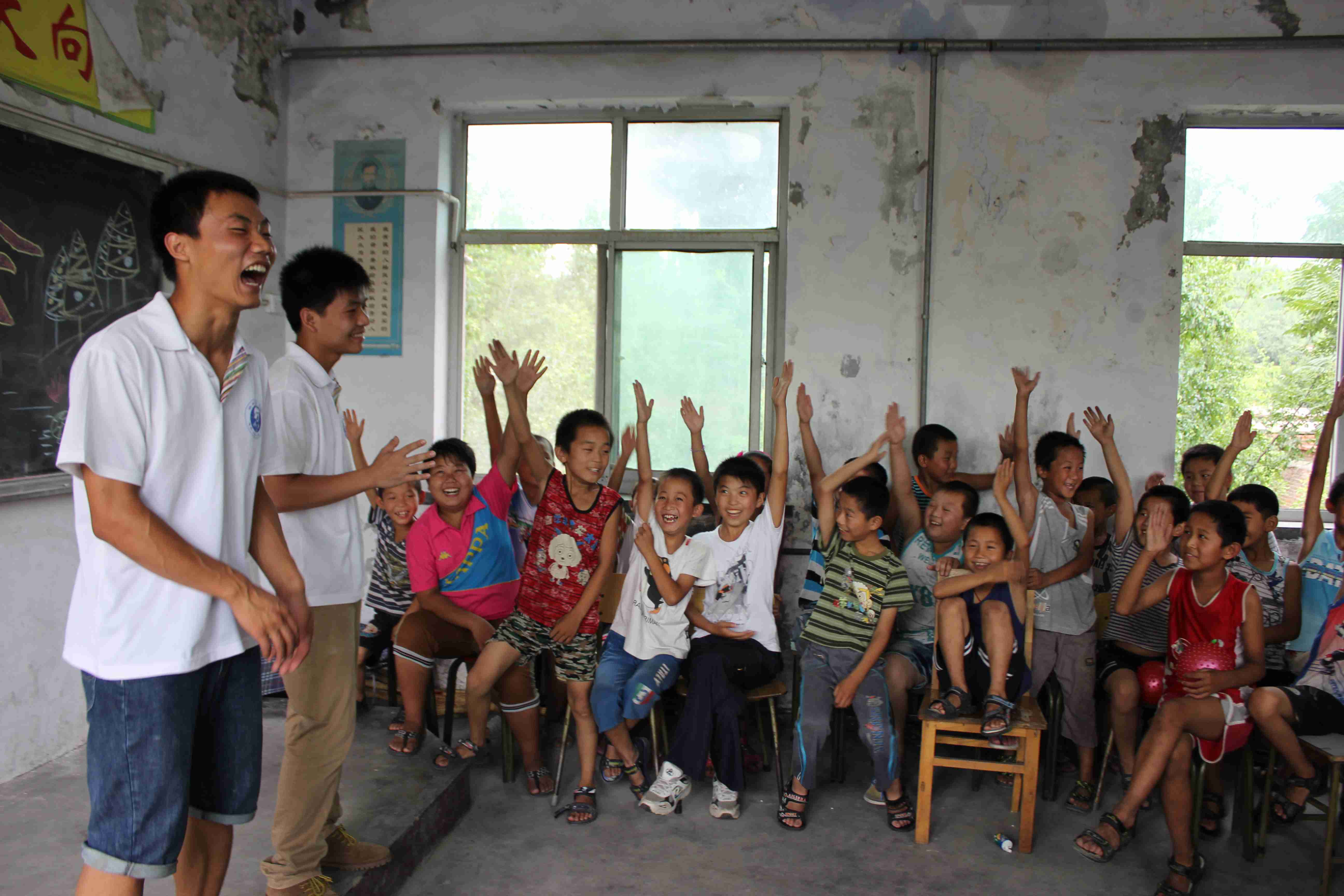 上午,周明铭在体育课上教孩子们接力跑。没有接力棒,我们就用空水瓶代替。一根根“接力棒”,传递着快乐,也传递着孩子们的信念。王子鸣带着孩子们看电影《里约大冒险》,很多孩子们都是第一次看电影,三十几个孩子围着一个电脑屏幕,专注地看着,不时发出笑声和惊叹声。赵狄的故事课上,一个叫甄傲祥的孩子引起了队员们的注意。当他听到匡衡凿壁偷光的故事后,激动地说:“我家现在比匡衡家富裕,我要比他还用功读书!”队员们都深深受到了感动,山区的孩子,是多么渴望走出大山,看看外面精彩的世界啊!任景炎上了一节事故逃生讲解,讲述当大地震发生时,应该如何适时适当地选择逃生办法,紧急自救。孩子们认真地听课,在演练时,他们快速地撤出了教室,都聚集在空旷的操场上,整个过程有序而平稳,孩子们互相谦让,互相帮助,在下楼梯的时候,大孩子扶着小孩子。任景炎深有感触:“尽管是在演练,但孩子们没有放弃任何一个同伴,而且负责开关门的小朋友照顾到了所有人。”刘菲琳在活动课上,教孩子们唱英文儿歌,灵动的旋律,惊喜的眼神,快乐的笑容,都深深印在了队员们的脑海中。