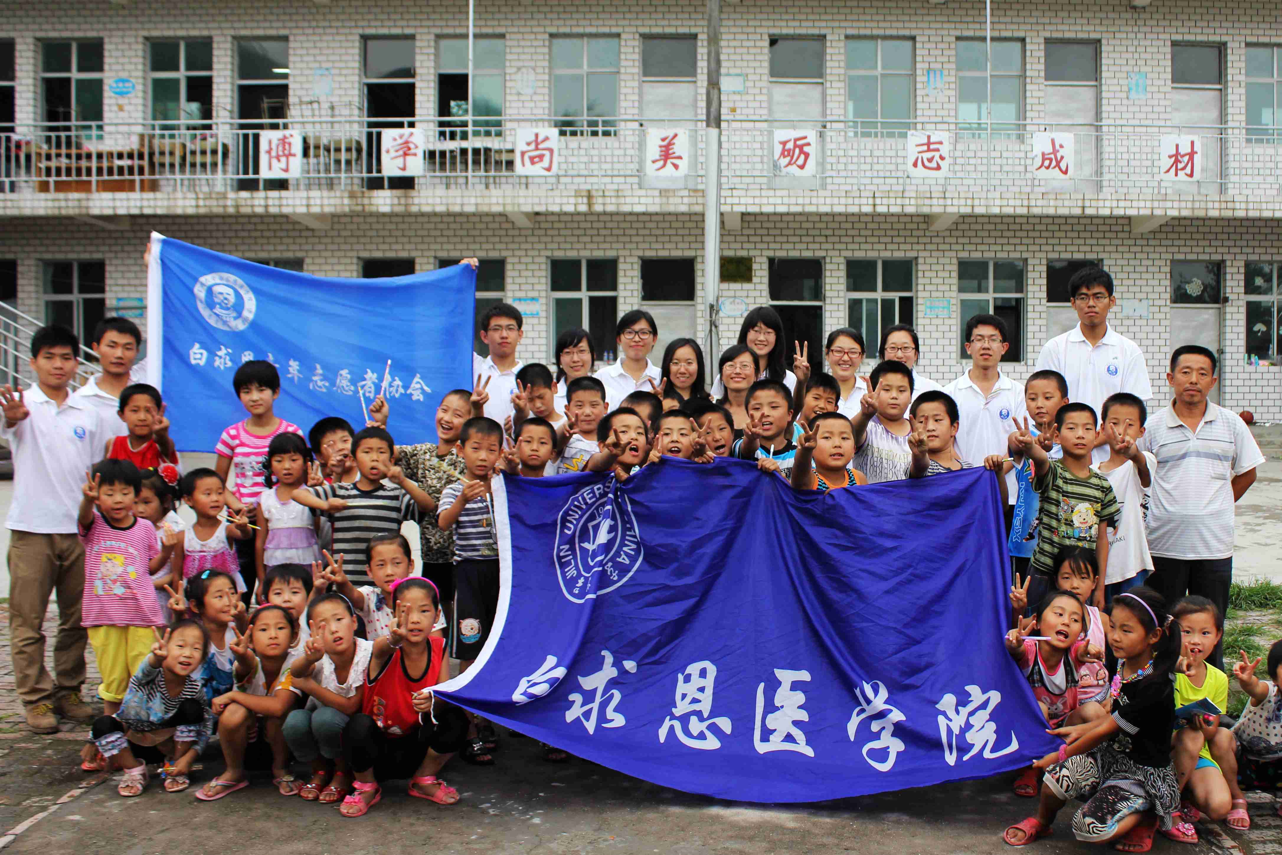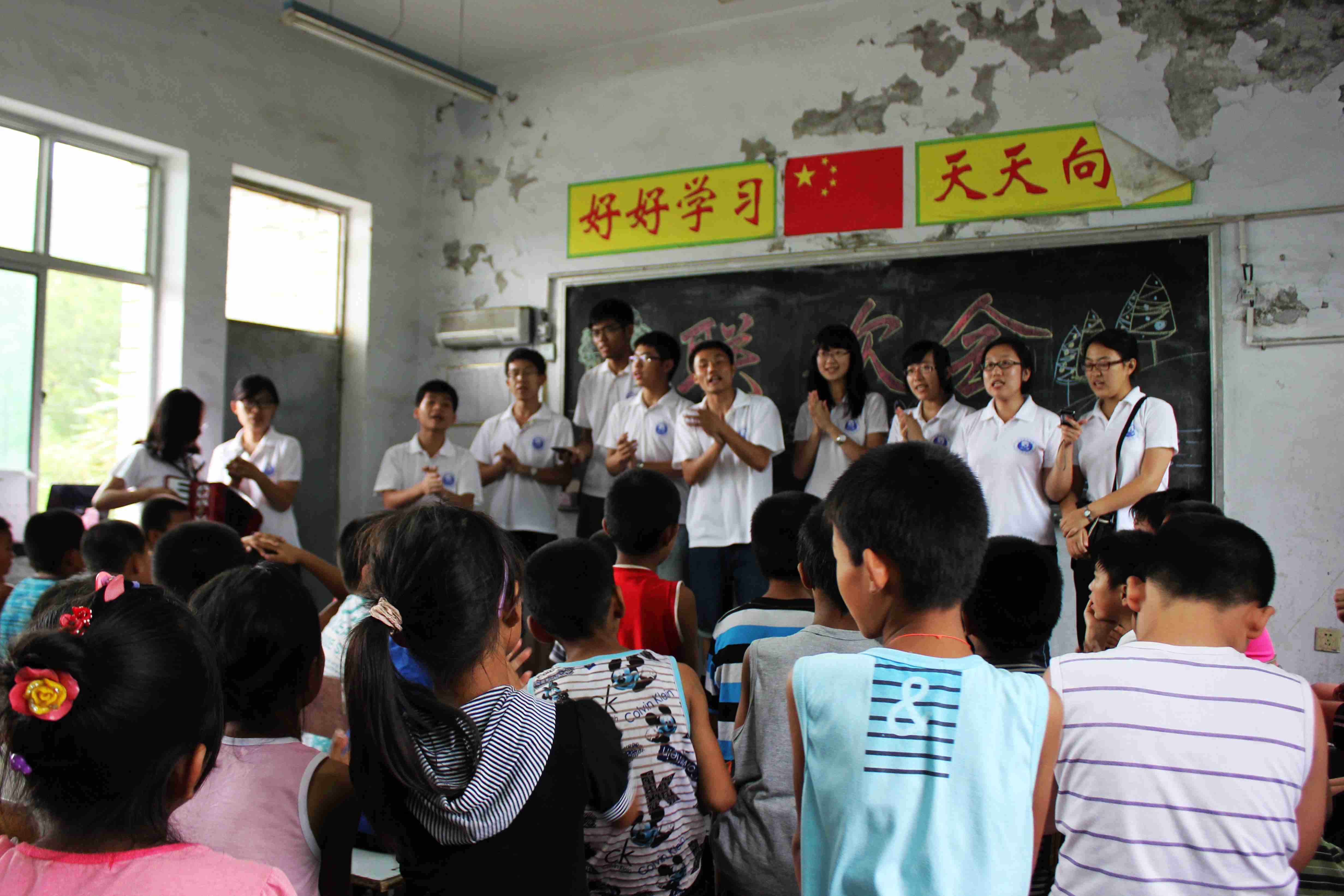 下午,精心准备的联欢会如期进行。李腾海担任主持人。孩子们踊跃地走上讲台,积极地表演节目。《小燕子》、《悯农》、兔子舞、精彩的节目相继上演。社会实践小分队队员们也毫不逊色。李腾海、周明铭携手表演的《新贵妃醉酒》,张颖异表演的手风琴,指导教师孙娇、队员刘菲琳倾情献唱的一组儿歌,以及由带队教师魏宇航领舞的《nobody》,引来了阵阵掌声和欢笑。最后,队员们为孩子分发奖品并合影留念。夕阳西下,我们所有队员目送着孩子回家,也有很多孩子依依不舍地拉着队员的手,还有一些孩子们落下了纯真的眼泪。孩子们的笑脸,孩子们的笑声,孩子们的笑容,都浮现在队员们的眼前,他们的眼神,他们的期盼,他们的梦想,都深深刻在队员们的心中。我们将永远记着,在那大山深处,有这样一群孩子,他们可爱又单纯,他们执着而坚毅,他们以白求恩为荣,他们渴望着外面精彩的世界。今天,因为我们的到来,他们种下自己的梦想,明天,因为他们的努力,他们将收获丰硕的果实。