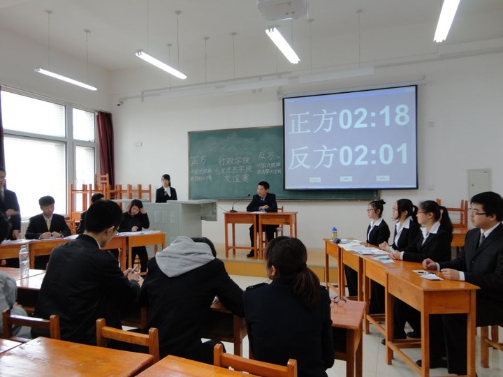 4月15日下午,白求恩医学院与行政学院联手举办的2011级友谊辩论赛于李四光楼309教室进行。本次辩论赛辩题为“中国式棍棒教育的利弊”。到场的评委有白求恩医学院的优秀辩手郝爽、姜莹和行政学院的李苏楠。