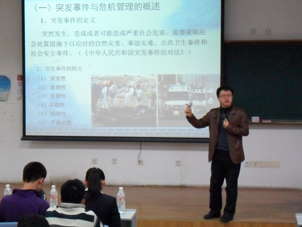 新民校区第二教学楼401室,以“突发事件与危机管理”为主题,进行讲座。本次讲座由白求恩医学院团委承办,校团委社会实践部部长韩月波出席了讲座。