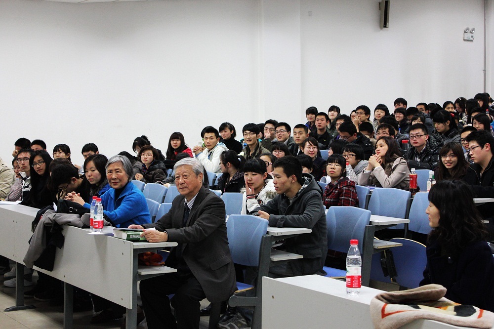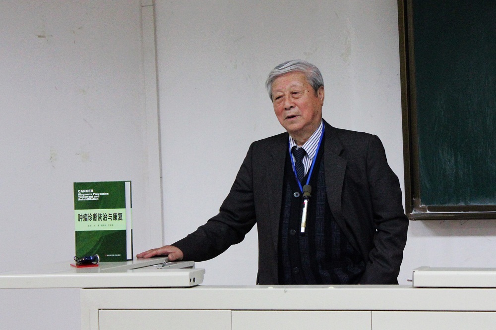 耄耋之年的刘谦教授、王桂茹教授分别对两人六十余年的从医经历及医学成就进行了简要介绍。刘谦教授向学生们介绍了他历经两万多个日夜完成的医学著作《肿瘤诊断防治与康复》。刘教授表明这本医书是向祖国母亲的献礼,是对广大癌症病人无私奉献的回馈。随后,刘教授介绍了这本书的出版概况及国内外学术界反应,又以“三基”、“五性”为基点,临床经验为指导,创新为向导说明了指导思路,对内容提要的“六个论”进行了解读。在讲解的过程中,刘教授强调了创新思想的重要性,对未来医学发展表明了自己的看法,并对医学生们提出殷切期望。