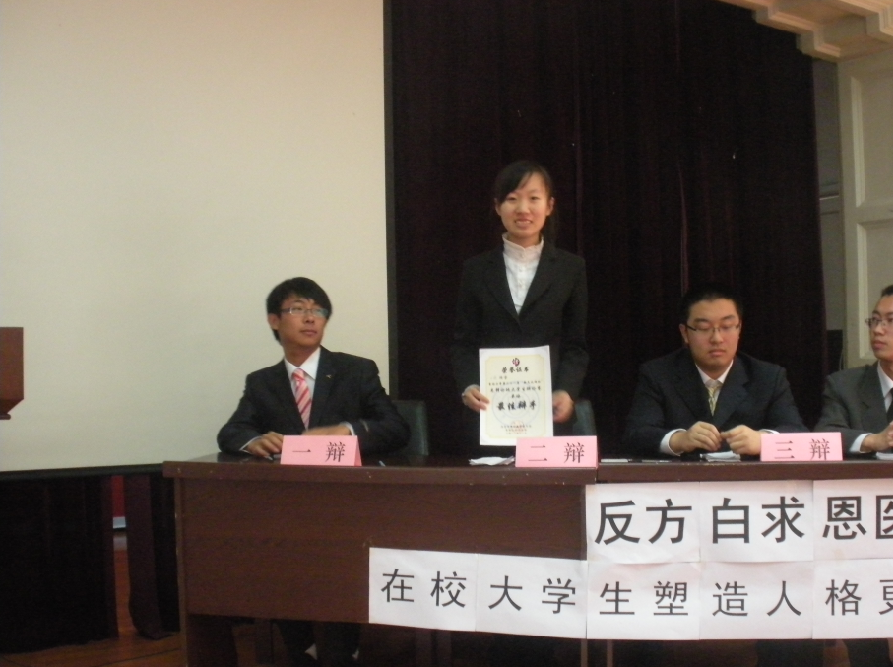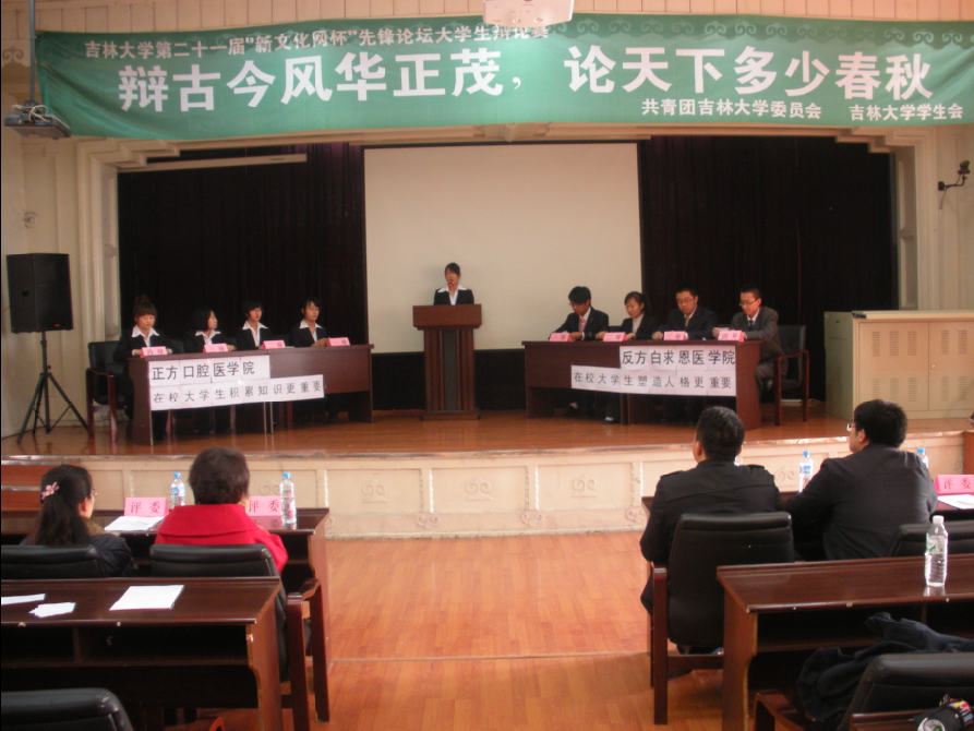 第二十一届“新文化网杯”先锋论坛大学生辩论赛初赛在基础楼二楼多功能学术报告厅举行。本场辩论赛的正反方分别为白求恩医学院代表队与口腔医学院代表队。双方就“在校大学生应注重积累知识还是塑造人格”展开了激烈的辩论。