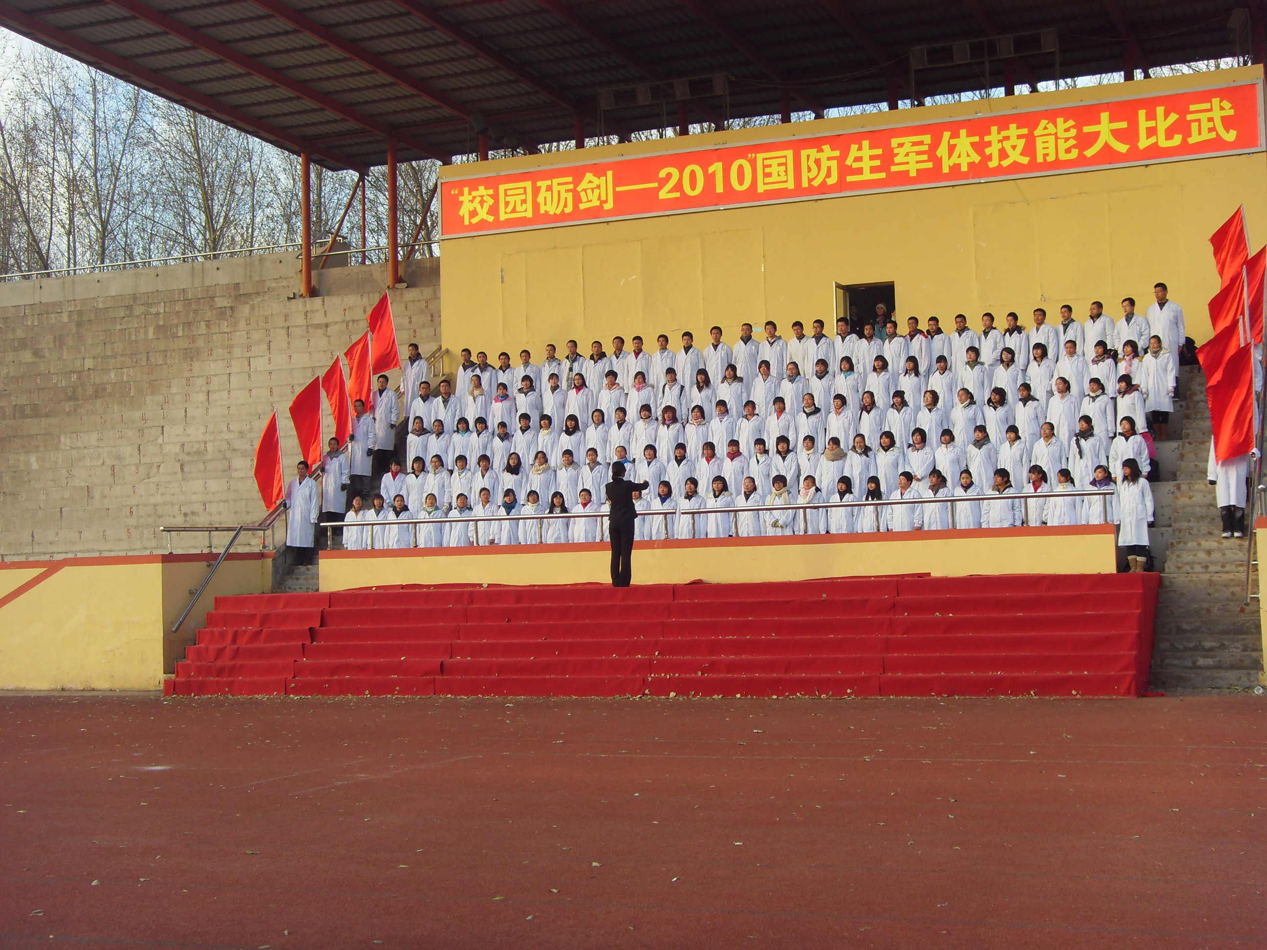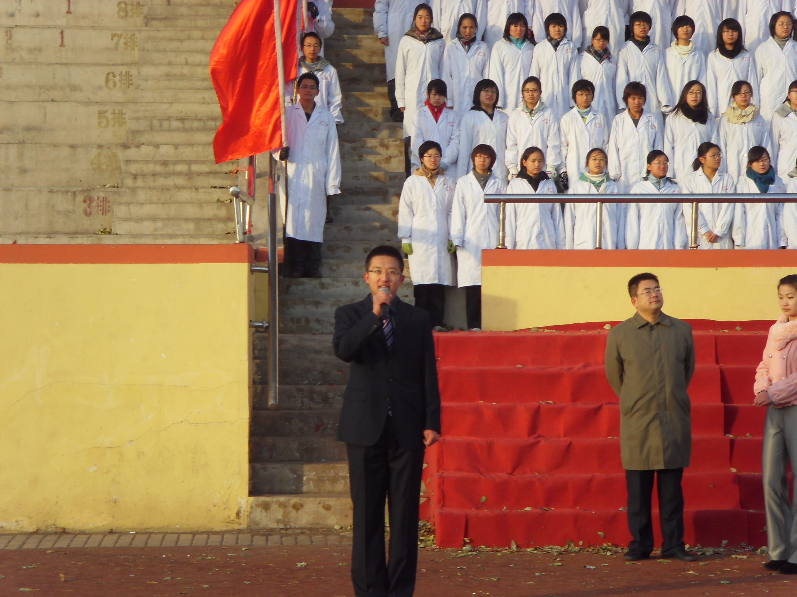 白求恩医学院2010级年级长李建男担任升旗手,基础园区学生会团委副书记兼学院2010级体育部部长邹运、2010级医学试验班团支书朱宇航担任护旗手,他们和同学们组成的国旗护卫队意气风发,迈着整齐的步伐、庄重而肃穆的护送着国旗走向升旗台。学院2010级长学制所有女同学则身着一袭白衣,以准医生的身份立誓为国家效力,并以一首响亮的《红旗飘飘》表达了对红旗的热爱、对祖国的赤诚。