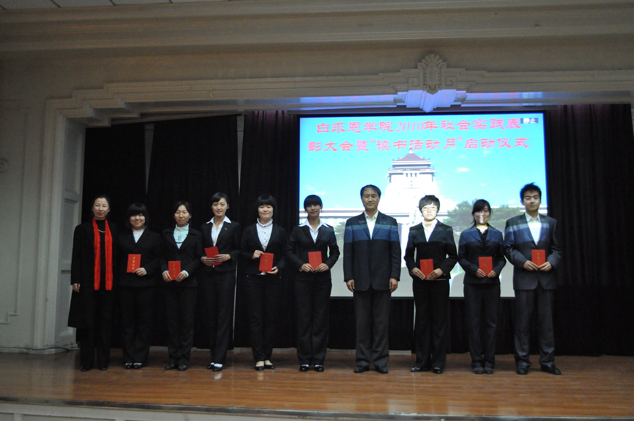 9月28日18时,白求恩医学院2010年社会实践表彰大会暨“读书活动月”启动仪式在基础楼二楼多功能学术报告厅召开。学院党委书记屈英和、副院长程丕显、党委副书记兼副院长苑锐、生物化学教研室副教授张纪周、学生工作办公室主任吴剑锋、团委书记夏燕来、辅导员秦雪及学生代表参加了会议。会议由学生会秘书长崔梦莹主持。
