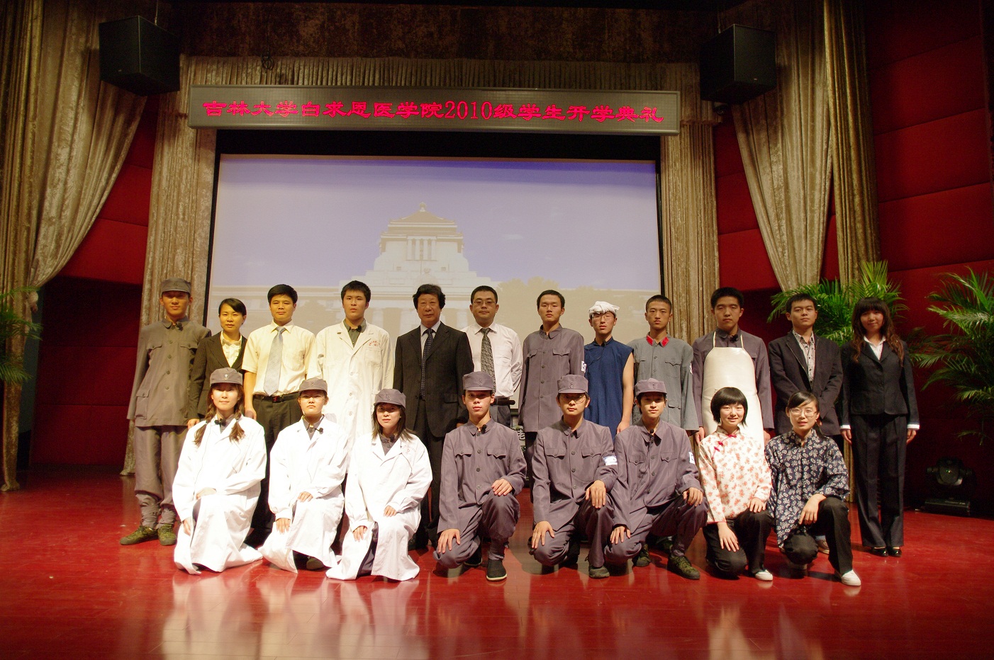 话剧表演结束后,李玉林教授鼓励大家要作一名优秀的白求恩式的医务工作者,做到政治坚定、医德高尚、医术精湛。最后,学院领导与演员们亲切合影。
