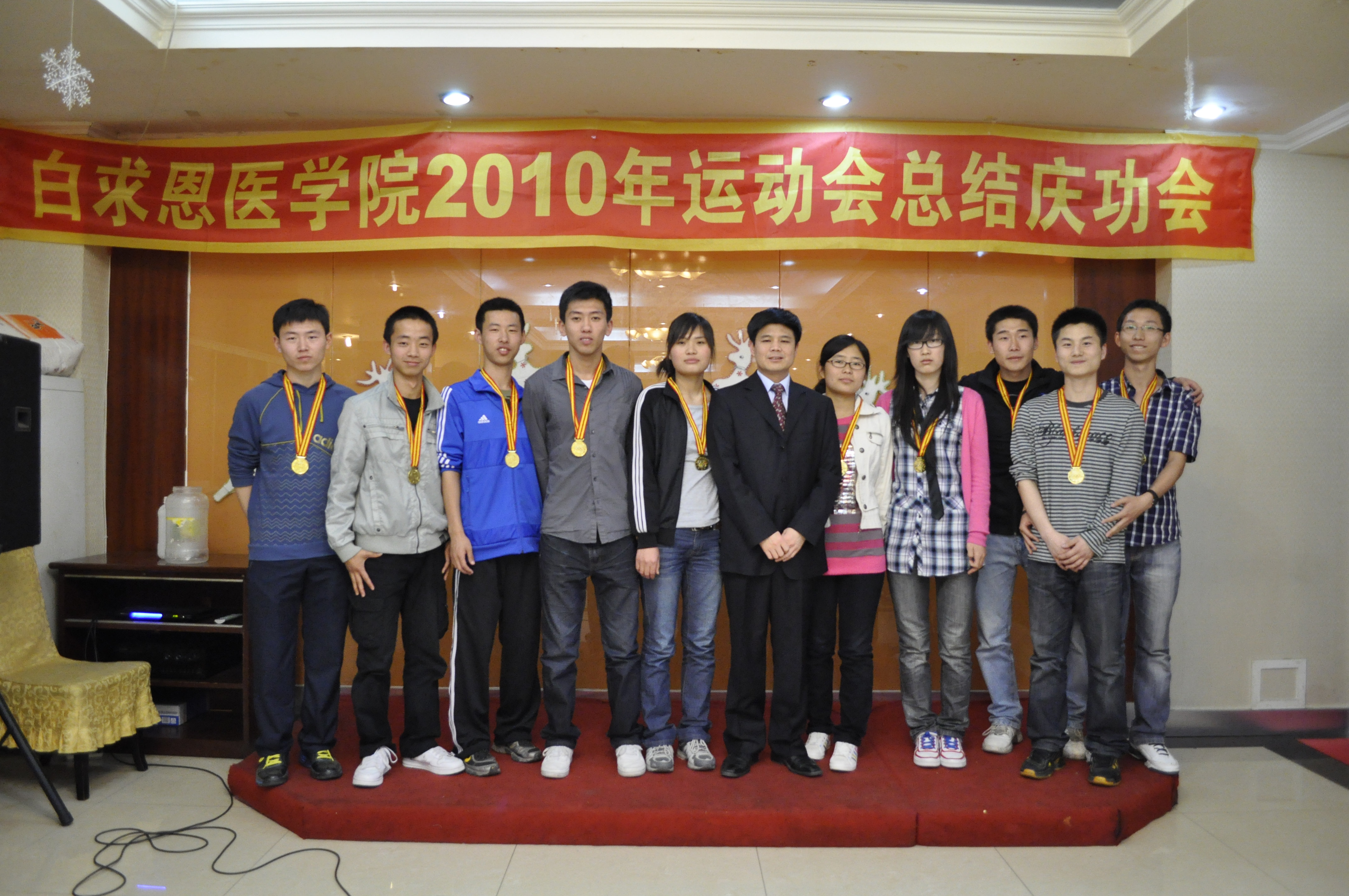 5月14日晚,白求恩医学院2010年运动会总结庆功会在西中华宾馆举行,学院党委书记屈英和、党委副书记兼副院长苑锐以及学院全体运动员、工作人员参加了总结庆功会。会上,党委书记屈英和为获得五四接力长跑冠军的十名运动员颁发金牌,党委副书记苑锐为在运动会各项比赛中获得前八名的运动员颁发证书。