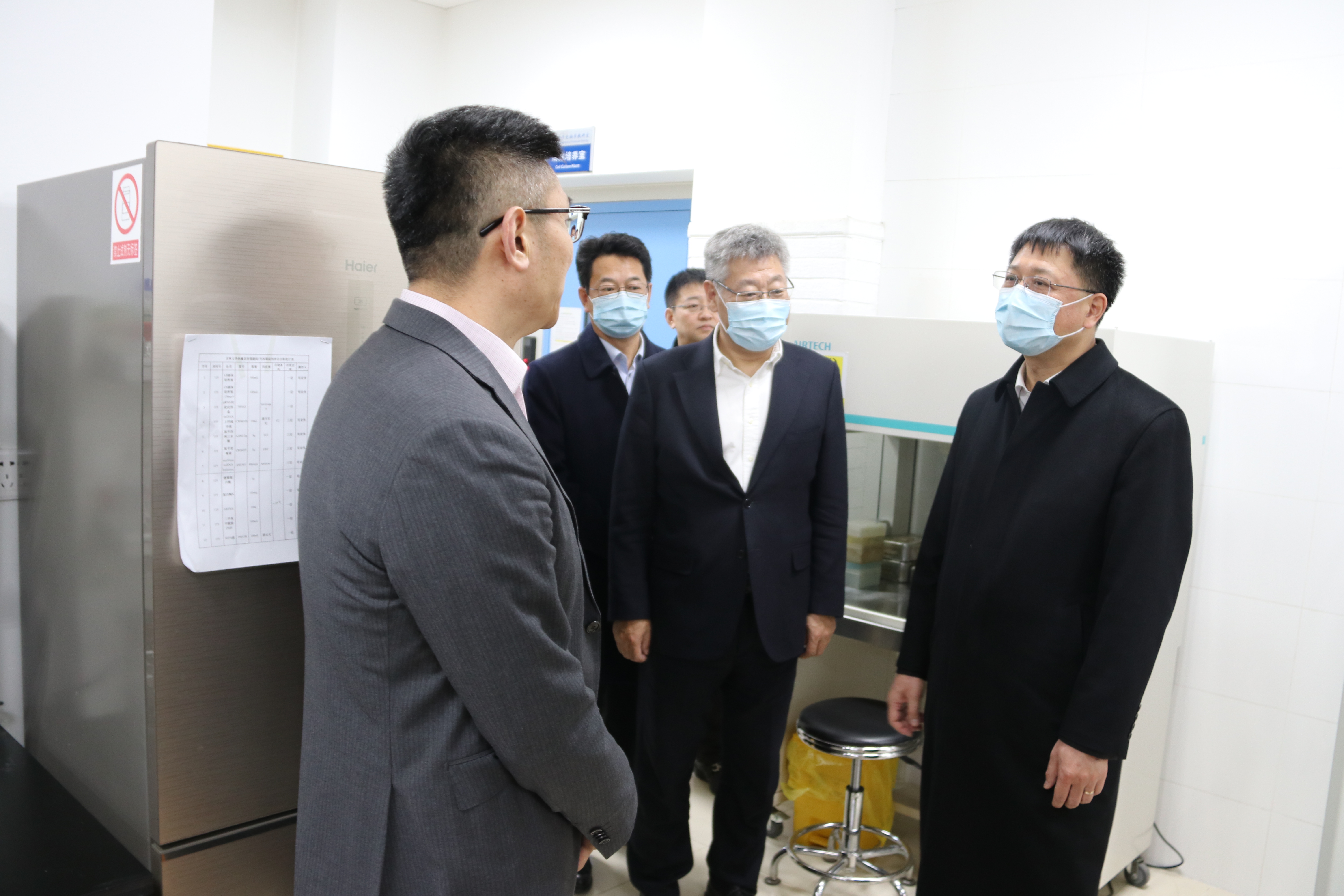 张希校长一行查看了学院的实验教学和实验室安全情况,对学生实验室安全进行了重点检查。张希校长先后来到学院天然药物药效基因分析联合实验室、分子生物学教研室、吉林省斑马鱼基因工程实验室、动物生物安全二级实验观察设施以及病理生物学教育部重点实验室。张希校长详细询问了学院在抗疫期间研发试剂盒的应用范围和使用原理,王放院长对冠状病毒基因检测试剂盒(基因芯片法)及其使用情况给与一一解答,校长对学院为新冠肺炎疫情的防控和治疗做出的突出贡献给与赞许。张希校长表述斑马鱼作为“脊椎类模式动物”在国际上有很大的应用范围,他对学院的斑马鱼工程给与充分肯定并寄予厚望。在与病理生物学教育部重点实验室的教师交谈中,张希校长强调学院一定要将安全放到学生实验教学首位,并逐渐扩大大型实验仪器使用范围,加强大型实验室仪器在本科教学中投入使用。