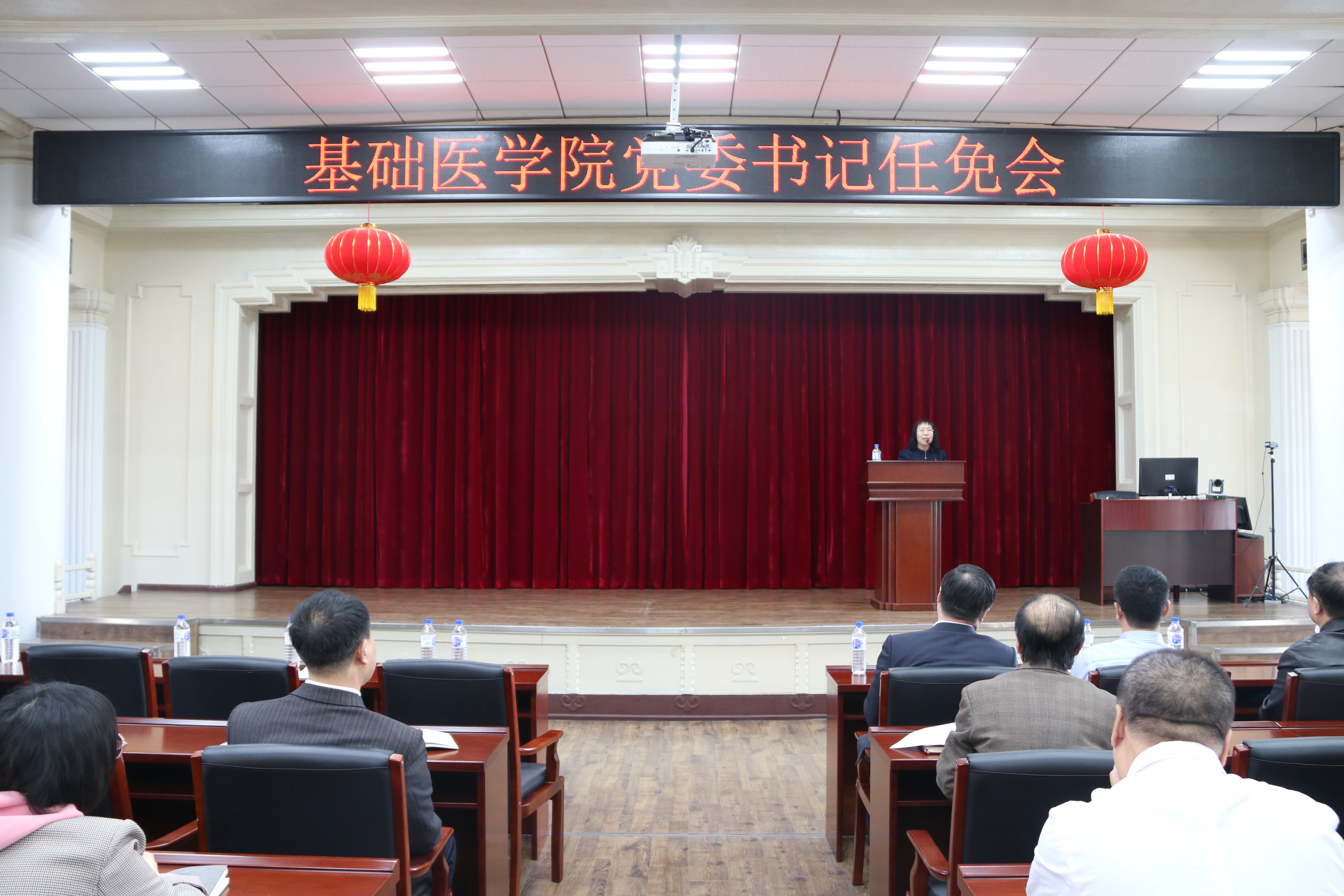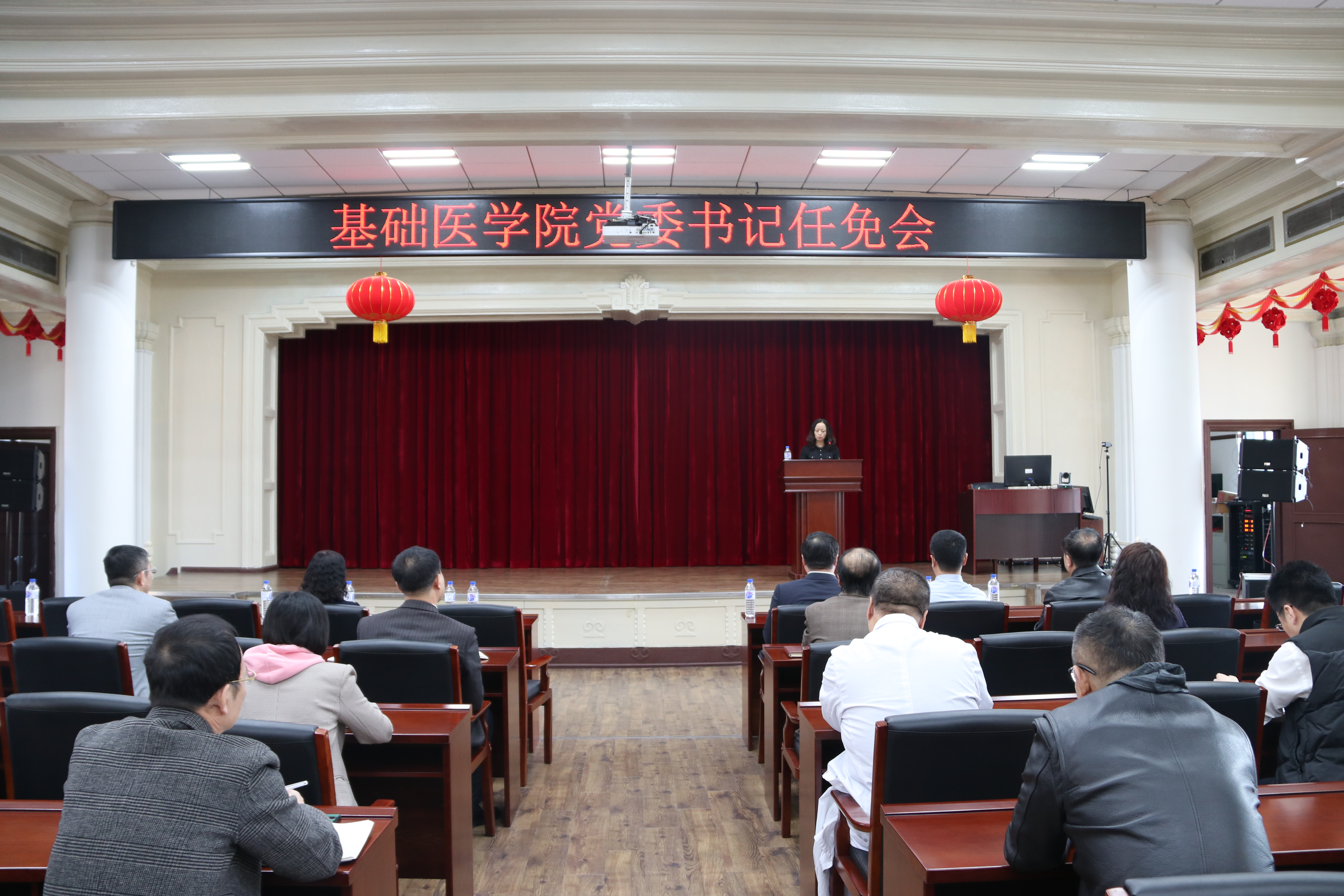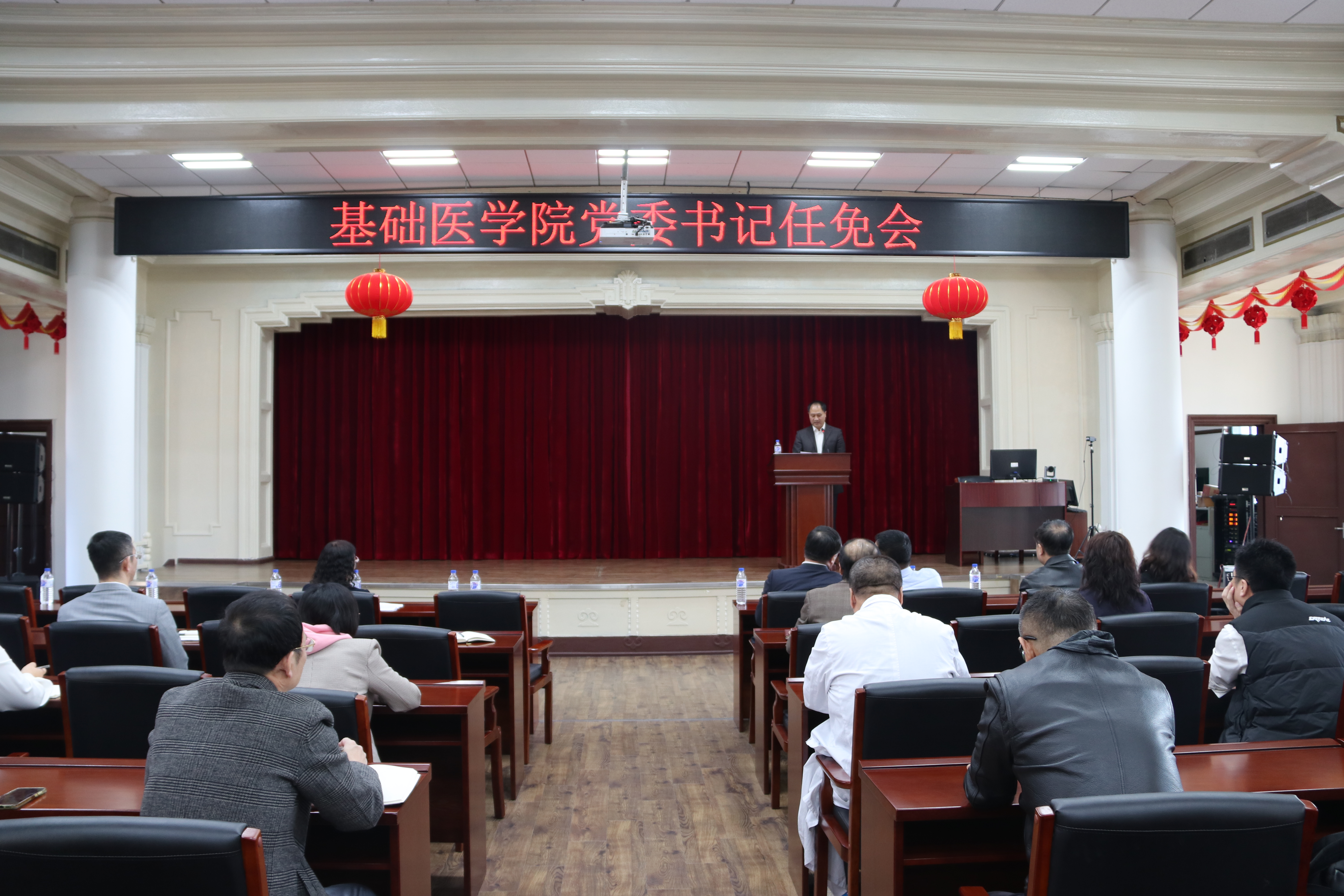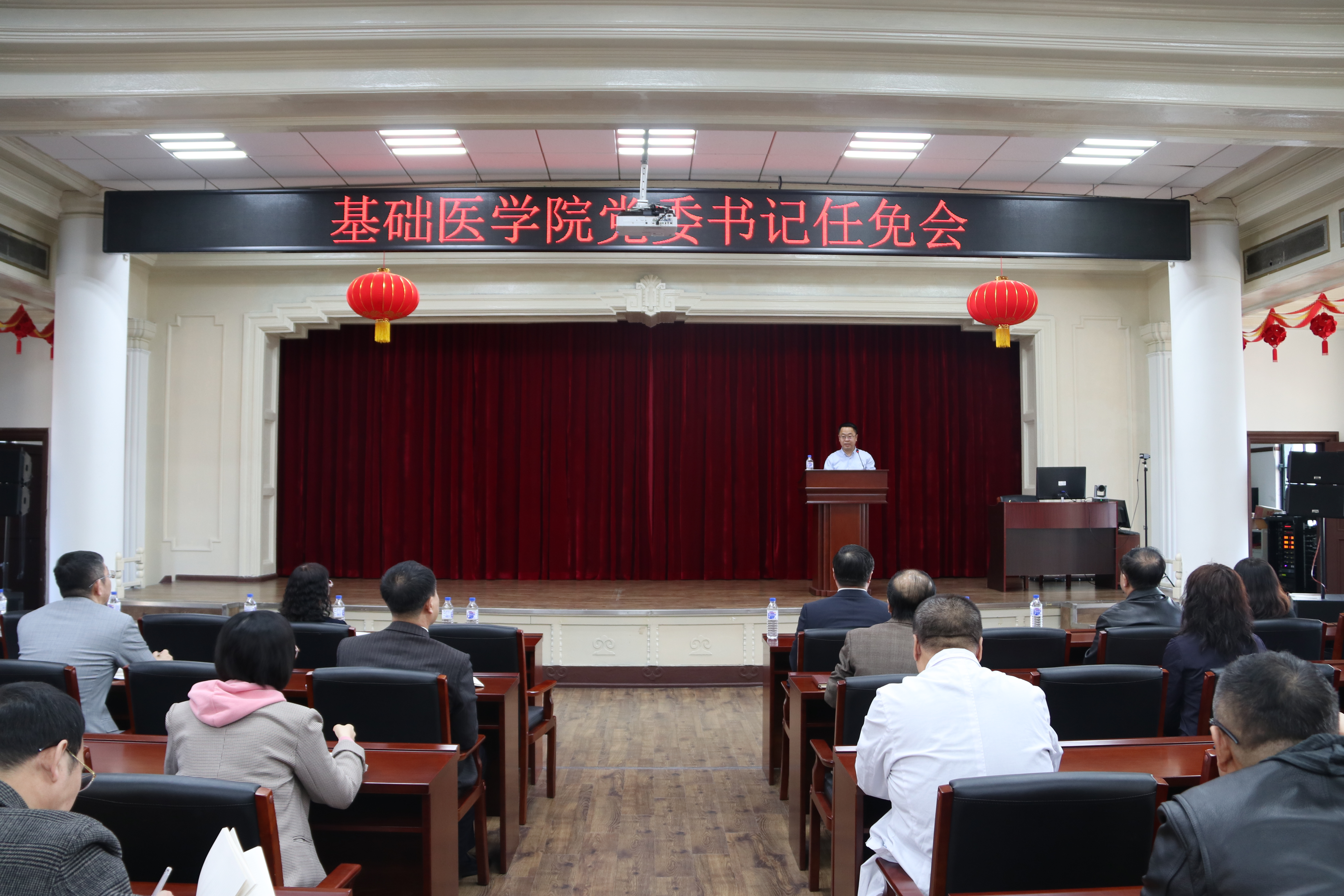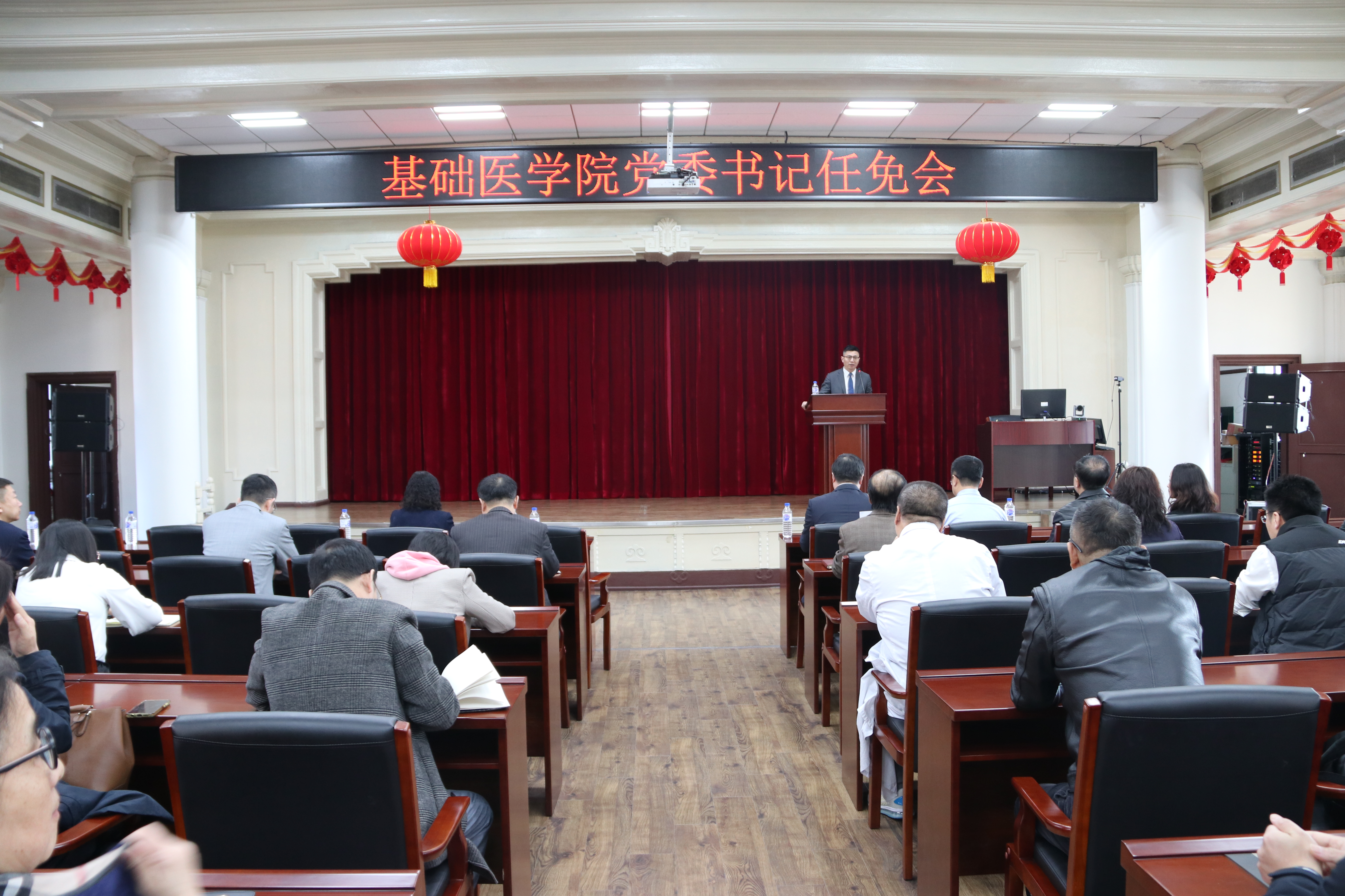 副校长、白求恩医学部学部长赵国庆,党委组织部部长巩英春出席会议,学院现任党政领导班子全体成员,党委委员、纪委委员,基层监察员,学院各系(教研室、中心)主任、全体行政人员和教工党支部书记参加了会议。会议由学院院长王放主持。