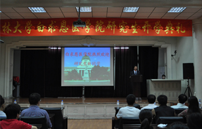 开学典礼在庄严的国歌中开始,常务副校长兼白求恩医学院院长李玉林发表讲话。首先,他代表学校、学院感谢2009级研究生能在众多医学院校中选择来我院学习,同时,对他们表示祝贺和欢迎。随后,他回顾了我校七十年来的发展轨迹和优秀校友在医学领域中取得的骄人成绩,并对全体研究生提出了殷切希望。希望同学们大力弘扬白求恩精神,在学习科研工作中,要学会做人、做事,要经得起寂寞的考验,经得起失败的考验,经得起同行评价的考验,争取创造医学新的辉煌。