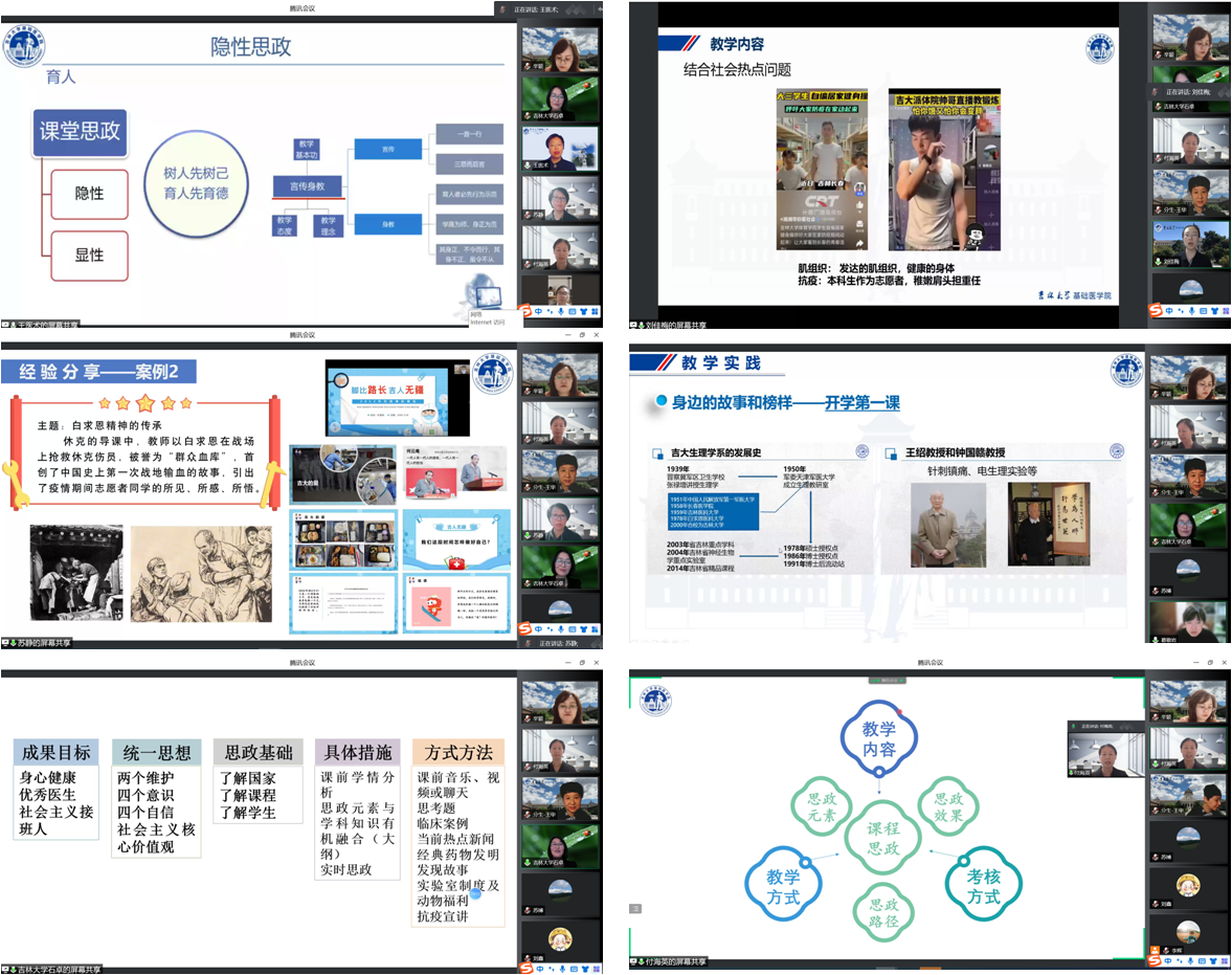 在汇报与分享交流阶段,十位教师结合各系学科特点,向参会的专家和老师们分享了疫情期间课程思政的教学设计与教学效果。病理学系的王医术教授分享了 “疫期《病理学》课程思政的实践与思考”,通过介绍病理学课程蕴含的隐性思政和显性思政,以大爱为基础,以大德为中坚,以大智为核心,实现无声融思政,有声育英才。组织学与胚胎学系刘佳梅教授汇报了“同新战役,同屏共振的思政分享”。通过介绍组织学与胚胎学系通过优化教学内容、创新教学方法、创新考核评价体系,实现了课程思政教学效果的新高度。病理生理学系的苏静教授分享了“基于学生自驱力的思政元素设计策略”,让大家了解到病理生理学课程通过“简”以突出重点、“通”以凸显学生、“推”以强化能力、“拔”以培养卓越,实现了课程思政的无声融入。生理学系的葛敬岩教授分享了“融情入理,潜心育人”,通过介绍生理学系的开学第一课设计,为学生讲授身边的故事和榜样,展开生理学系的教学内容,将思政元素在第一课渗入到全部的课程学习中。药理学系的石卓教授分享了 “坚定信念,实时思政——药理学系课程思政情况汇报”,层层递进、环环相扣的教学设计,为我们展示了药理学课程思政安排的创新与巧妙。免疫学系的付海英老师分享了“无声育人,有声花开——医学免疫学课程思政实践与思考”, 通过介绍思政元素挖掘、思政路径设计、课程思政实施以及思政效果展示,体现了免疫学课程的育人无声、花开有声。生物化学学系的张纪周老师分享了“脚踏实地,思政育人——生物化学课程思政元素挖掘”,生物化学学系以本学期的线上教学抗疫宣讲和教学设计为例,通过真实性、趣味性、同理性、时效性以及新奇性展示了生物化学课程的育人细无声。分子生物学系的王华老师分享了“医学分子生物学课程中思政元素的渗透与融合”,通过介绍分子生物学的学科特点、从科学史中挖掘出课程思政元素以及如何将思政元素与学科特点有机融合,展示了分子生物学课程思政的设计与感悟。解剖系的刘辉老师分享了“追思感恩,责任担当,隐性思政,润物无声”,让我们了解到解剖学作为特殊的一门课程,教师在授课的同时,教会了学生如何尊敬和感恩大体老师,学系在积极投身教学的同时,也努力种好了课程思政责任田。细胞生物学系的何海涛老师分享了“医学细胞生物学课程思政的建设与实践”,通过教学理念、教学策略、教师培训与实践以及教学成果四个方面的介绍,展示了细胞生物学的思政设计。
