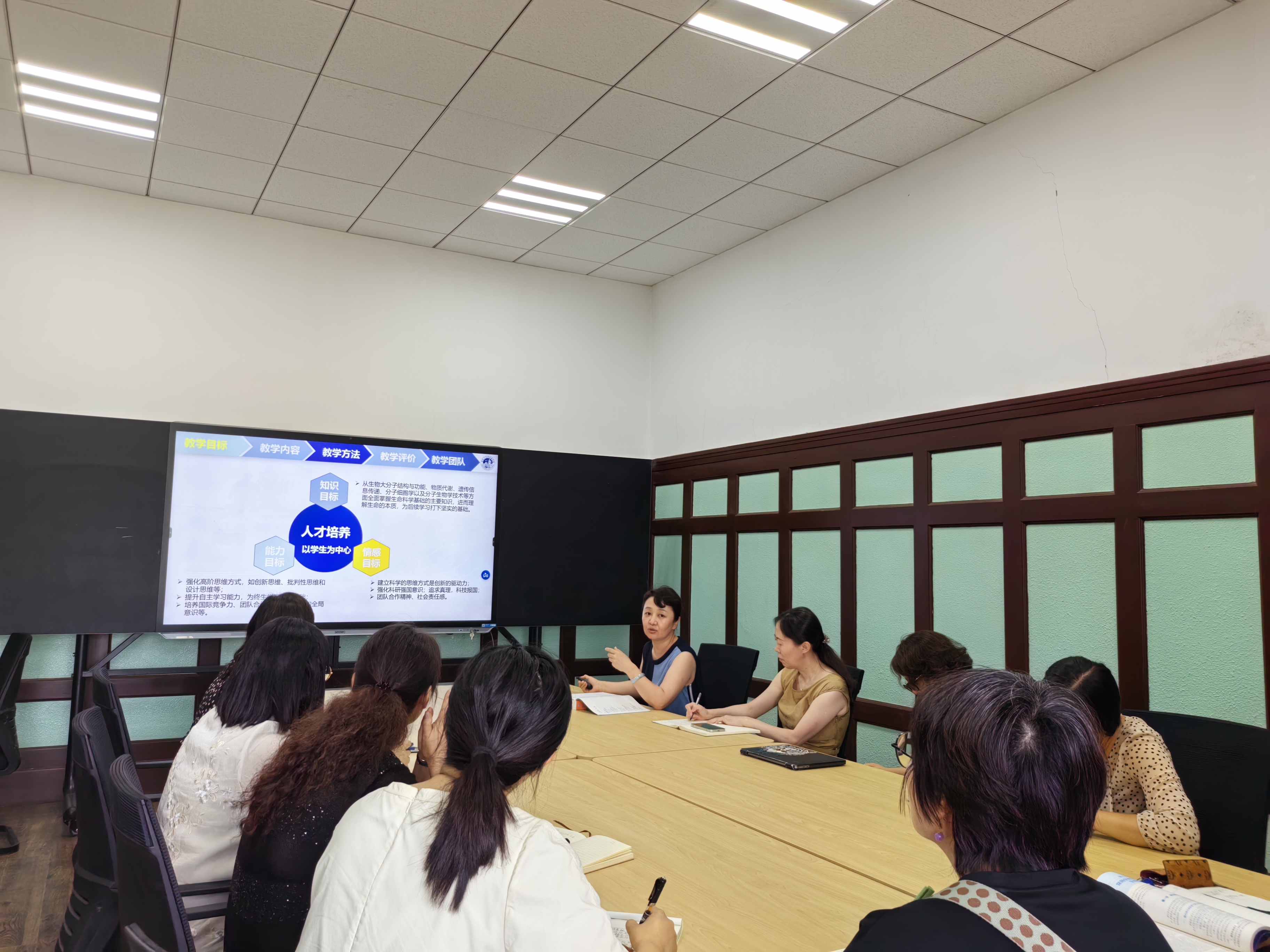 《生命科学基础》课程负责人阚慕洁老师分别从教学目标、教学内容、教学方法、教学评价、教学团队六方面介绍了课程相关情况,并详细阐述了课程六大模块的内容设置和学时分配情况。她建议老师们充分利用暑假假期进一步完善授课准备,完成学习通线上章节构建和教学资源整合。课程授课教师在开课前需完成授课课件、章节重难点视频以及课程试题库的制作、收集和上传;在教学过程中教师需要按模块布置作业,对学生进行章节测验并批阅,了解学生课程学习情况,及时调整教学计划和教学方法。随后,课程团队教师对教学内容、教学设计、教学方法等方面展开了热烈的讨论。最后,辛颖教授对本次备课活动给予了充分肯定,她建议将前沿进展相关研究文献引入课堂,进一步丰富线上拓展资源,引导学生运用思维导图构建课程知识体系框架。