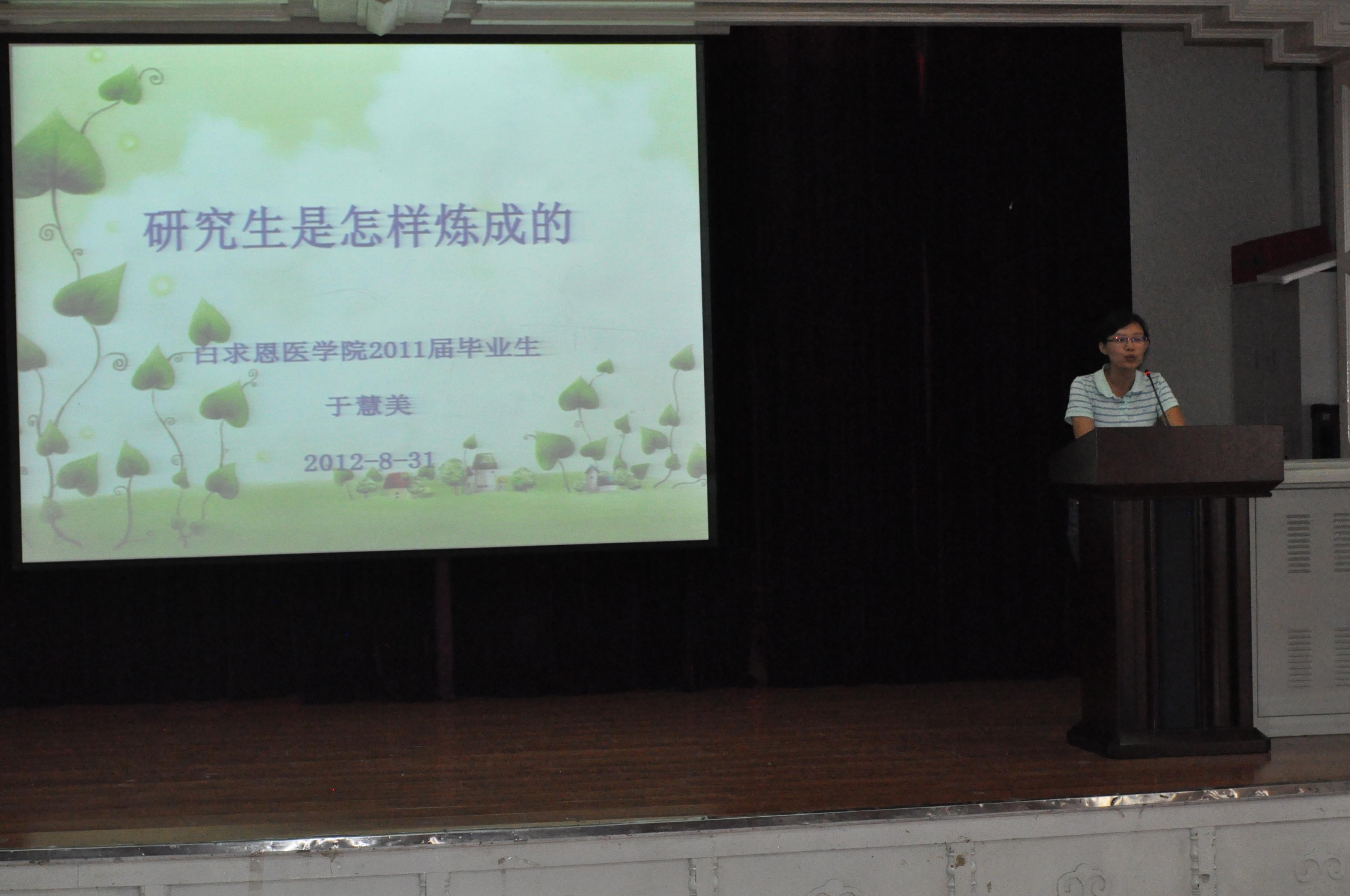 8月31日下午,白求恩医学院邀请了2011届优秀博士毕业生-—于慧美、徐慧在基础楼二楼多功能学术报告厅进行了研究生学术经验报告会。白求恩医学院主管研究生工作副院长李一雷、党委副书记费淑波和2012级研究生新生一起参加了报告会。报告会由研究生办公室主任黄梅主持。