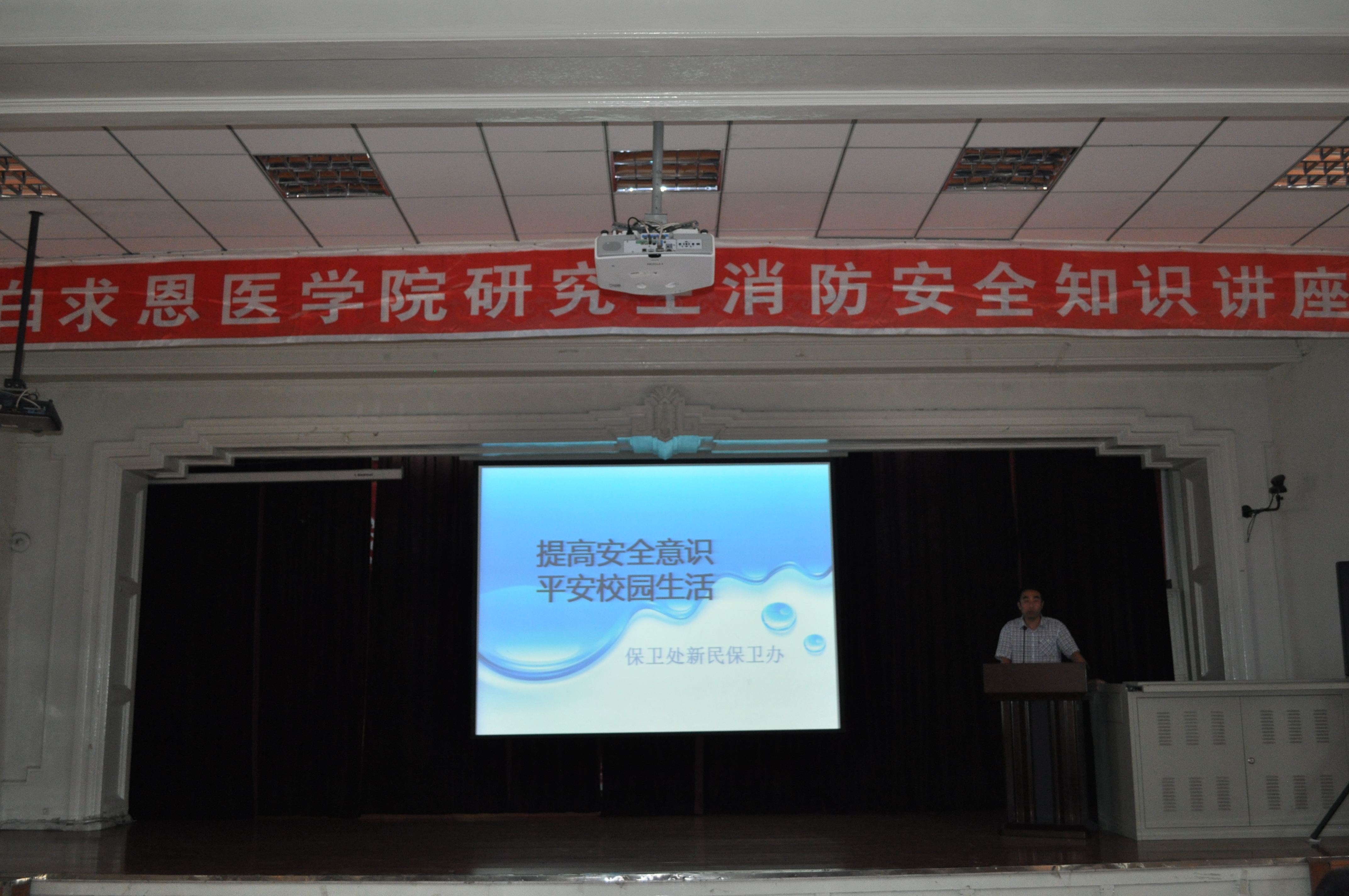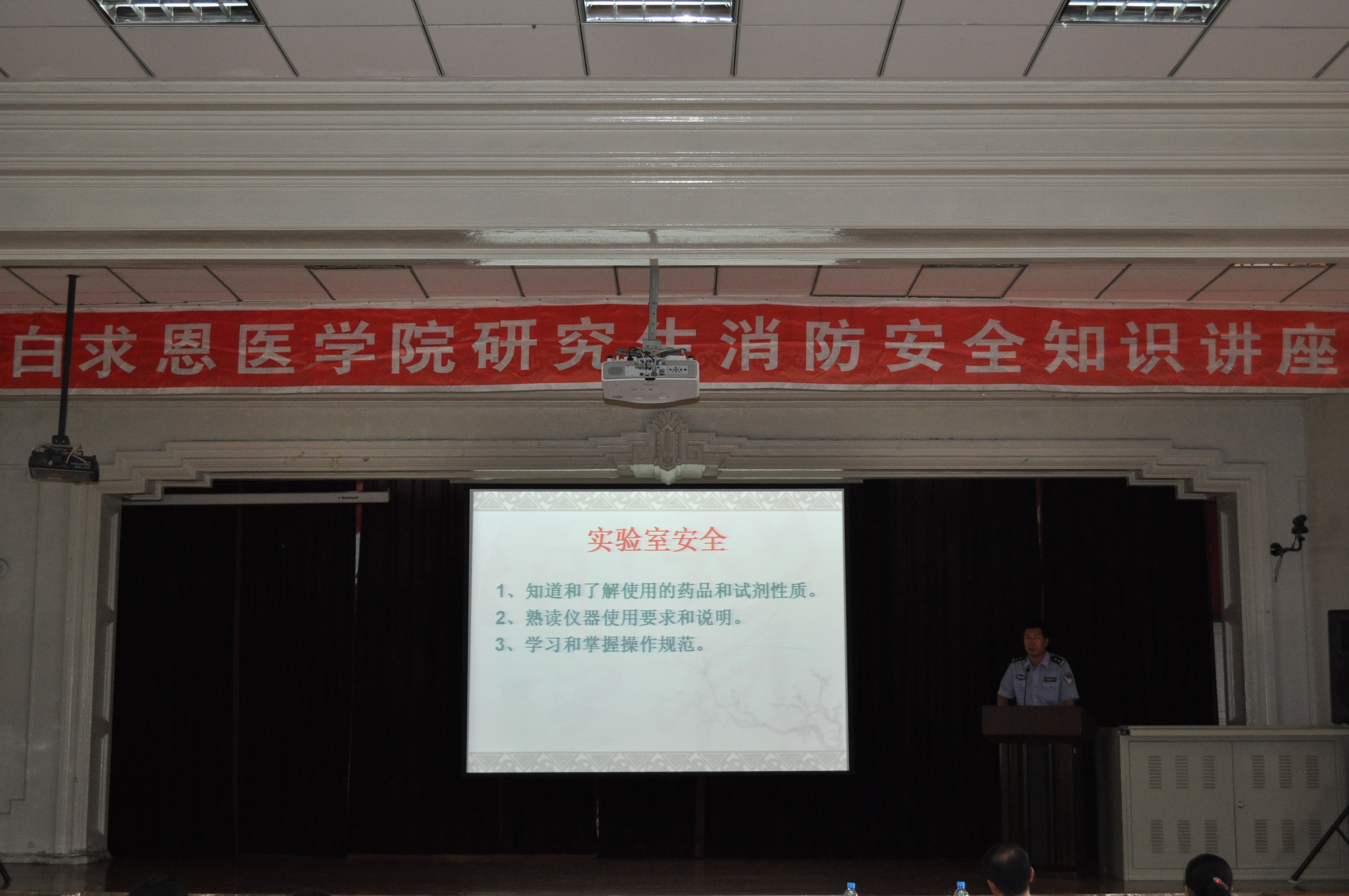 为增强研究生新生的消防安全意识,8月30日下午,白求恩医学院邀请新民校区保卫办科长安志成老师和郭云秀老师在基础楼二楼多功能学术报告厅为2011级研究生进行了消防安全知识讲座。讲座由学院研究生会主席李欧主持。