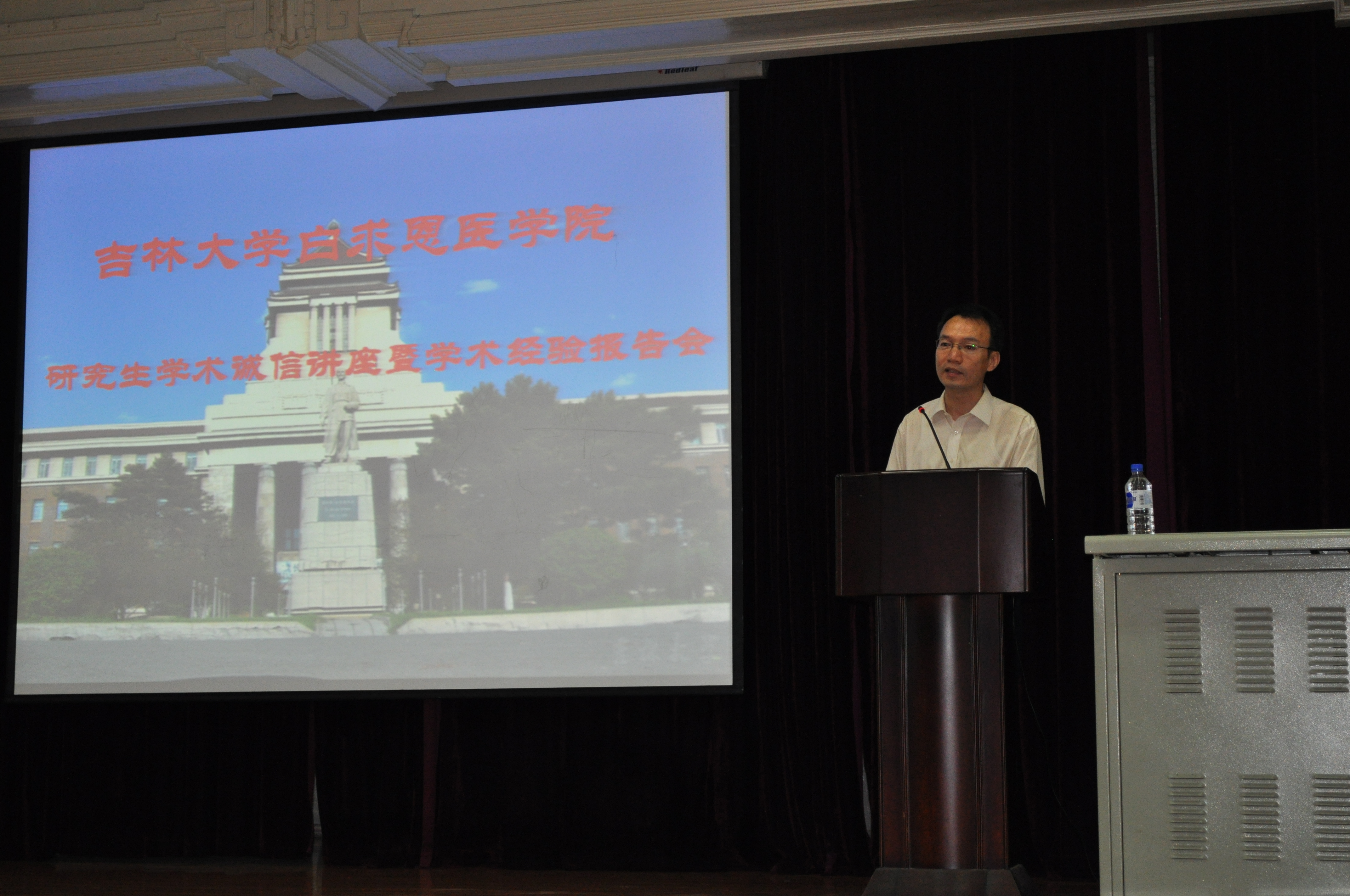 常务副校长、白求恩医学院院长李玉林教授强调了学术诚信的重要意义,希望研究生从自身做起,多向导师和师兄师姐学习经验,坚定学术诚信,不能做违反职业道德的事情,以白求恩为榜样,精益求精做科研、做学问。随后,李桐忠老师通过详实的案例分析,阐述了学术不端行为产生的严重影响和不良后果,并重点强调了有关学术诚信的文件。希望广大研究生诚实做人,勤奋做事,成为国家的栋梁之才。之后,孙连坤教授从院领导和导师角度出发,语重心长的对广大研究生提出了严格的要求,并希望同学们认真钻研,认真积累,正确处理好理想与现实的关系,提高个人的综合素质,争取成为真正的研究型人才。最后,李一雷教授在严谨学术和严格训练,学会工作,规划人生三方面对广大研究生提出希望,并给予具体指导。