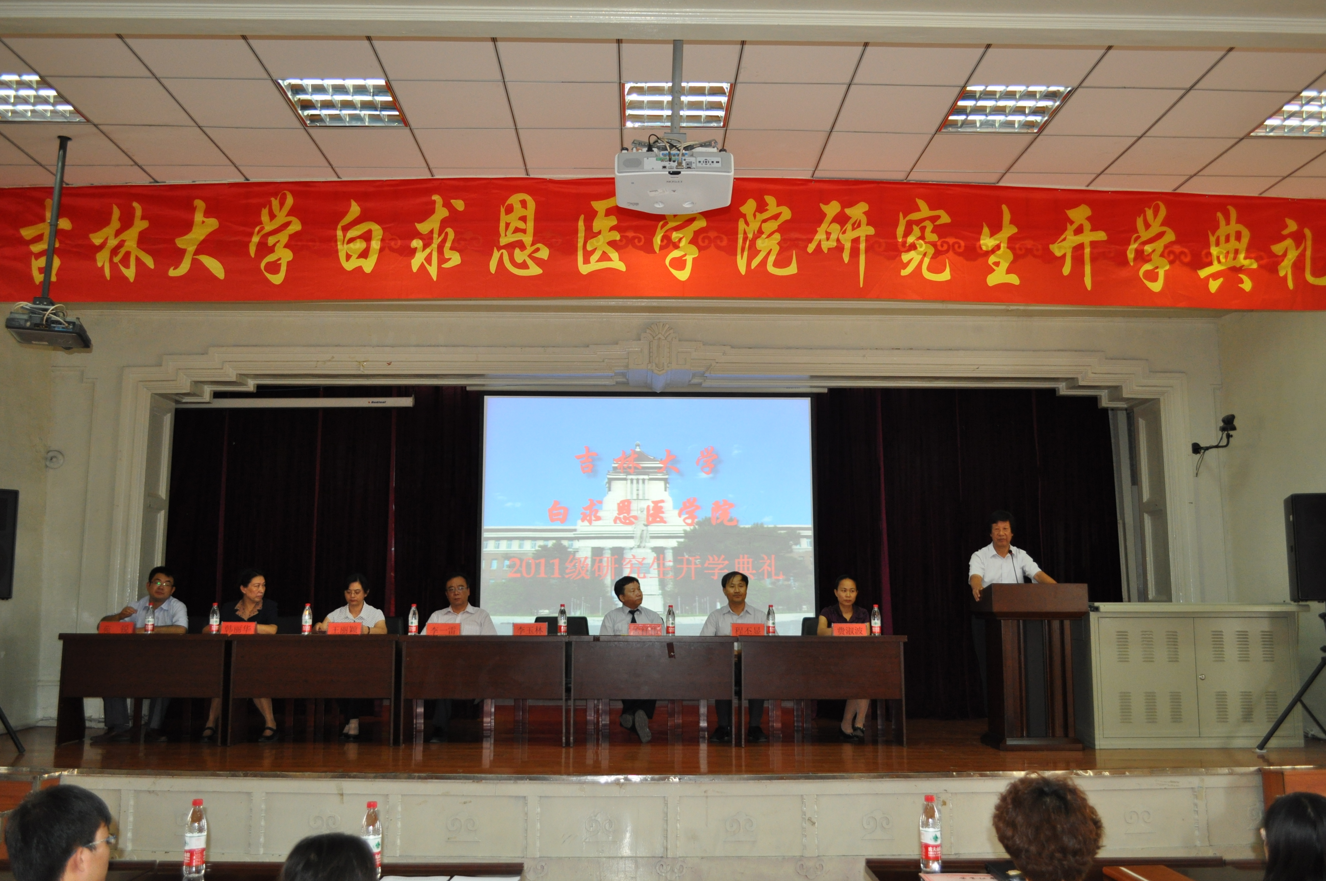 开学典礼在庄严的国歌中开始,白求恩医学院院长李玉林发表讲话。首先,他代表学院对2011级研究生表示祝贺和欢迎;随后,他介绍了白求恩医学院的发展历史,并对全体研究生提出殷切希望,希望研究生能加强自身全面素质的提高;加强自身能力的培养;做到三个“禁得住”,要禁得住寂寞的考验,禁得住失败的考验,禁得住同行评价的考验。
