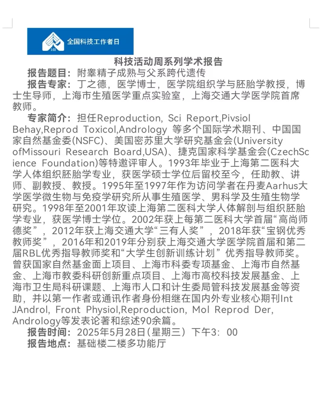 报告题目:附睾精子成熟与父系跨代遗传